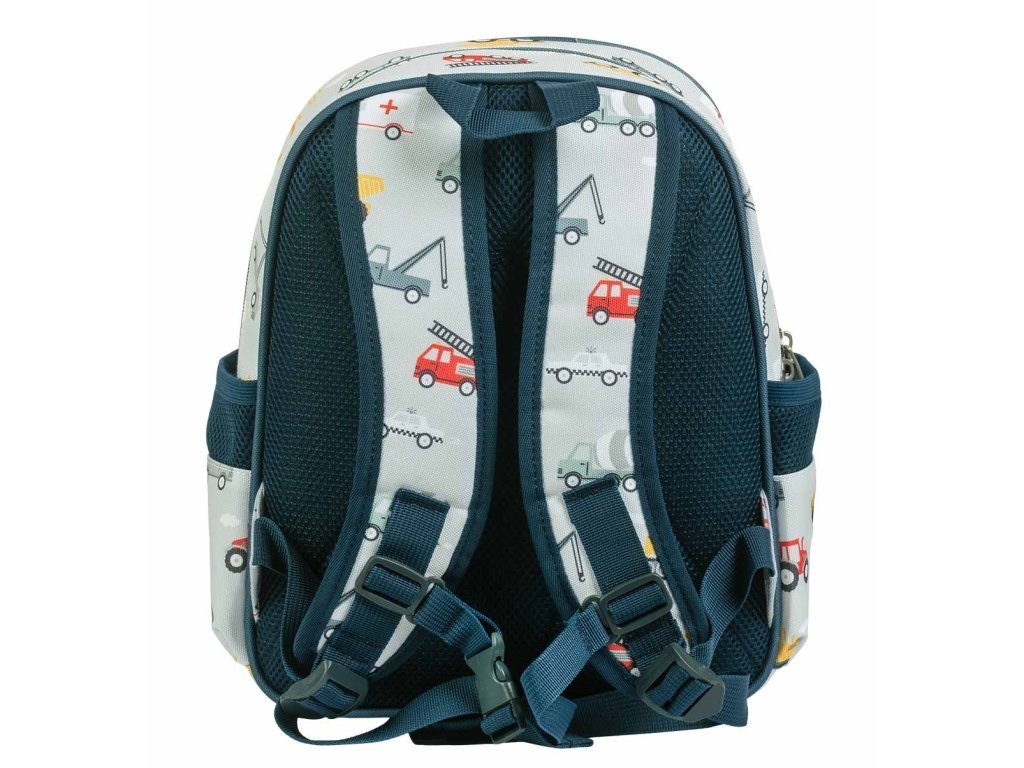 Prostorný světle modrý dětský batoh Vozidla od značky A Little Lovely Company, objem 16 l. Hlavní komora + izolovaná přední kapsa na svačinu, boční kapsy na láhev, polstrované ramenní popruhy, hrudní pás a prodyšný zádový panel. Ideální do školky i na výlety.