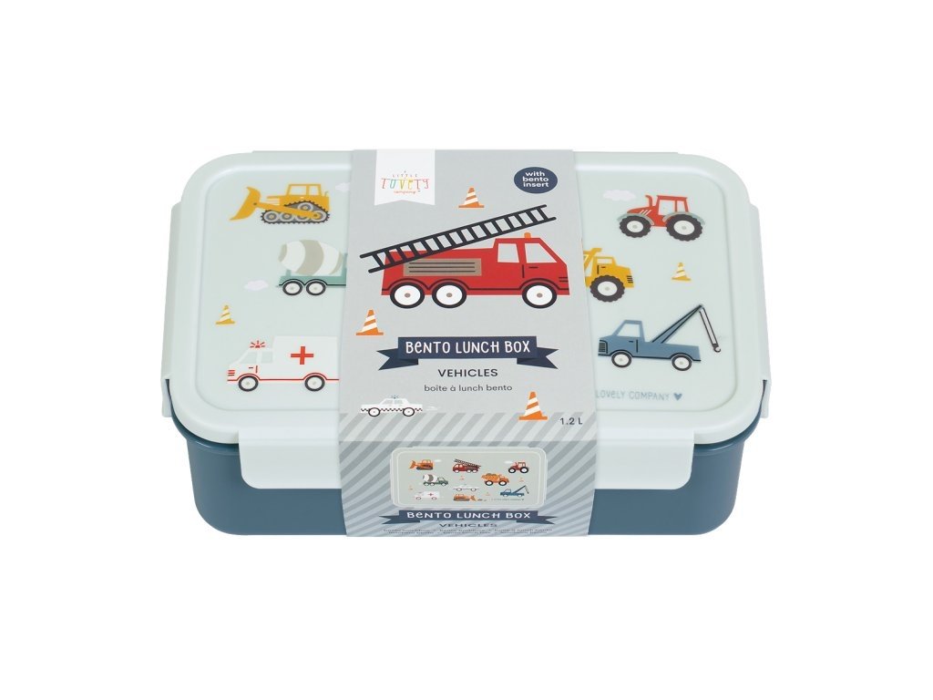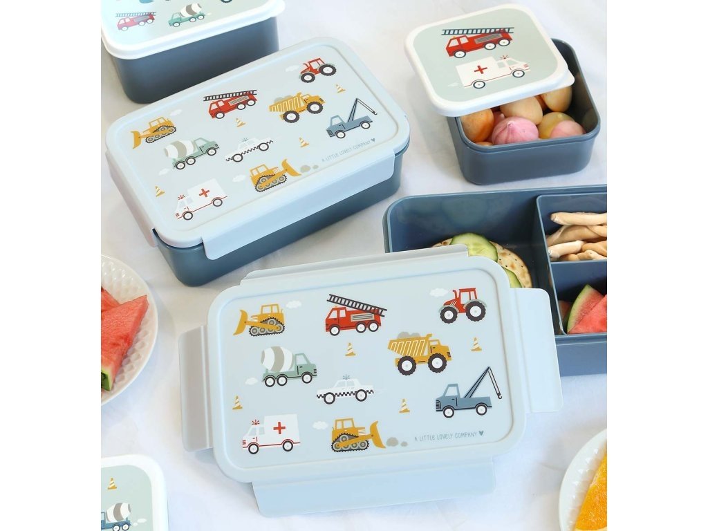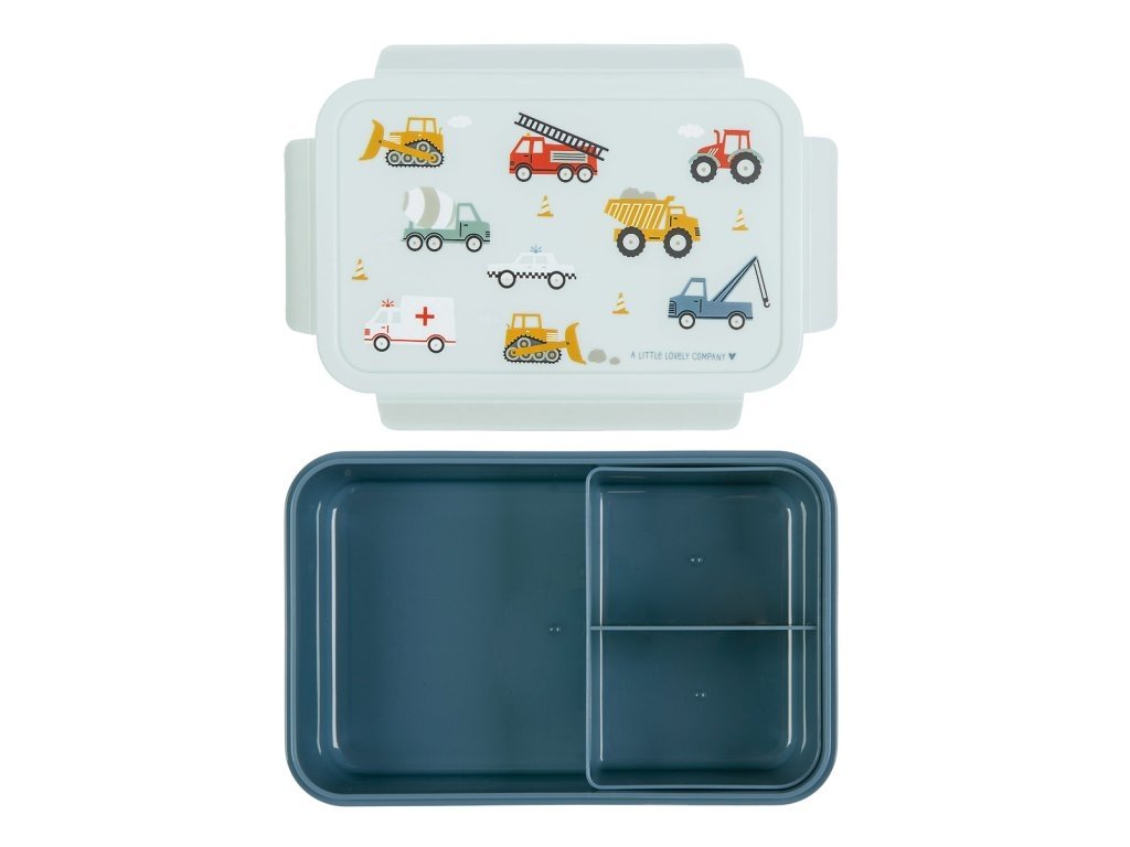 Praktická krabička na svačinu „Vozidla“ od A Little Lovely Company — světle modrá krabička 1,2 l s motivem aut, pevné plastové tělo z PP, vyjímatelná přihrádka se dvěma sekcemi, vzduchotěsné uzavření, ideální do školky či na výlety.