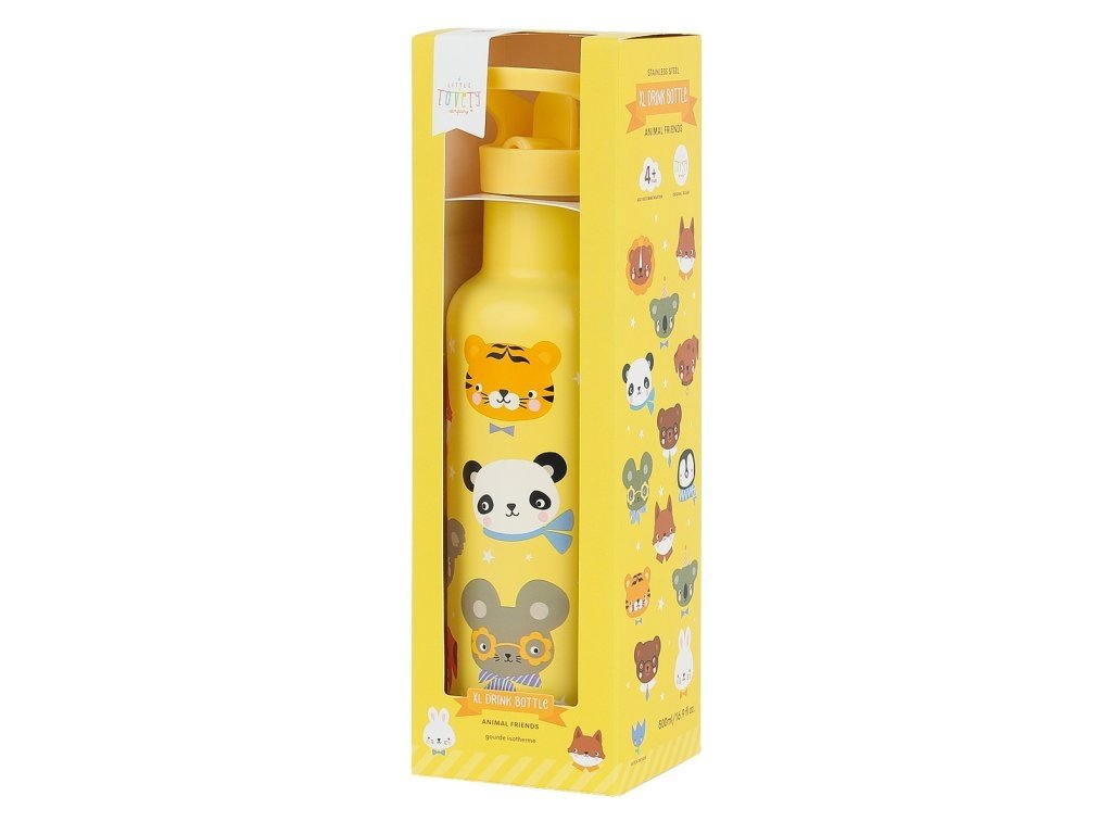 Extra velká nerezová lahev A Little Lovely Company s motivem zvířecích kamarádů (500 ml). Dvoustěnná konstrukce drží nápoje studené nebo teplé, víčko s hubicí a brčkem – ideální volba pro školu, výlety i každodenní dobrodružství.