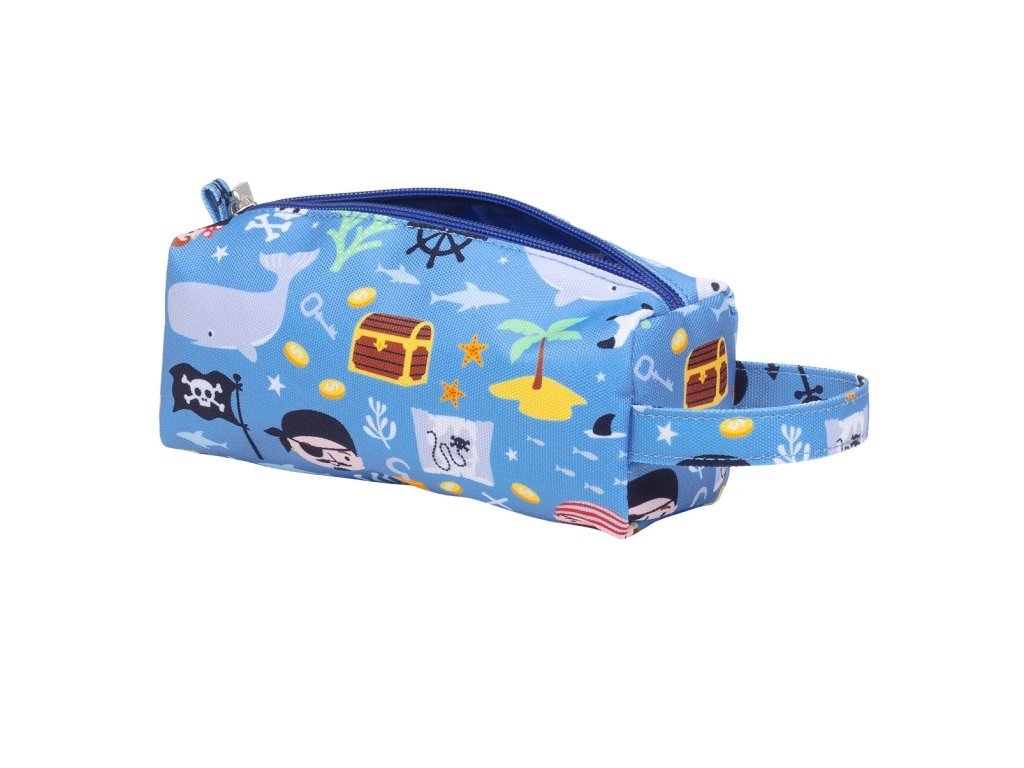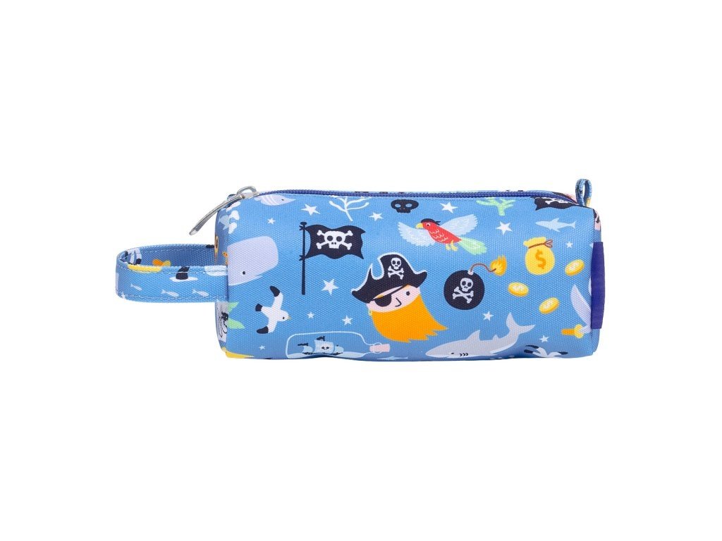 Pouzdro je vyrobené z kvalitního a odolného materiálu, který se snadno čistí, takže zvládne i každodenní dobrodružství. Pirátský design s lodí a veselými motivy děti nadchne a podnítí jejich fantazii.