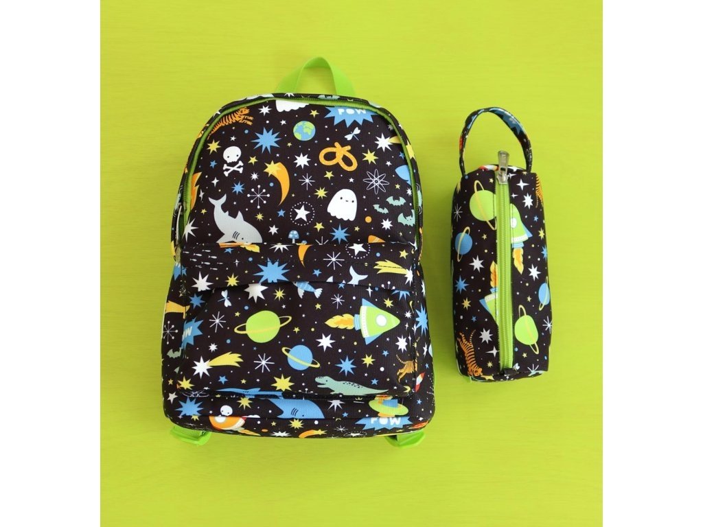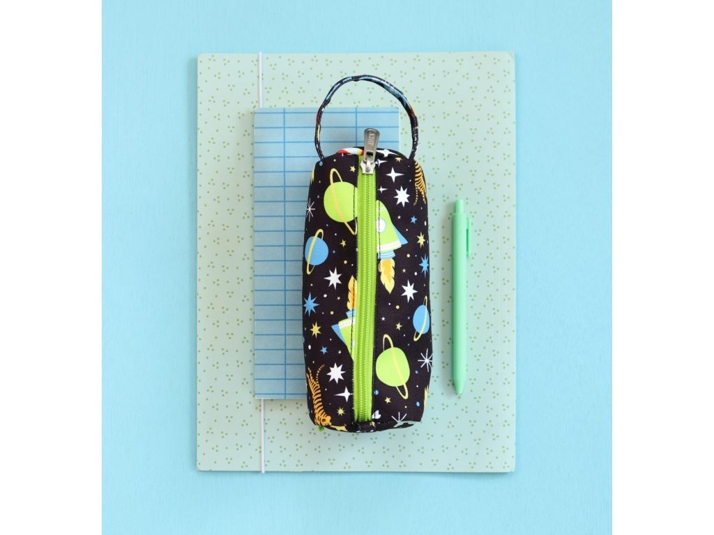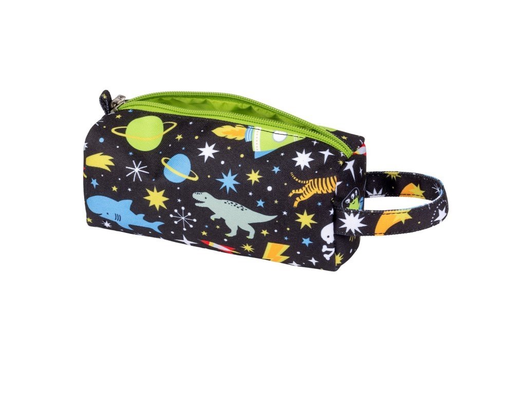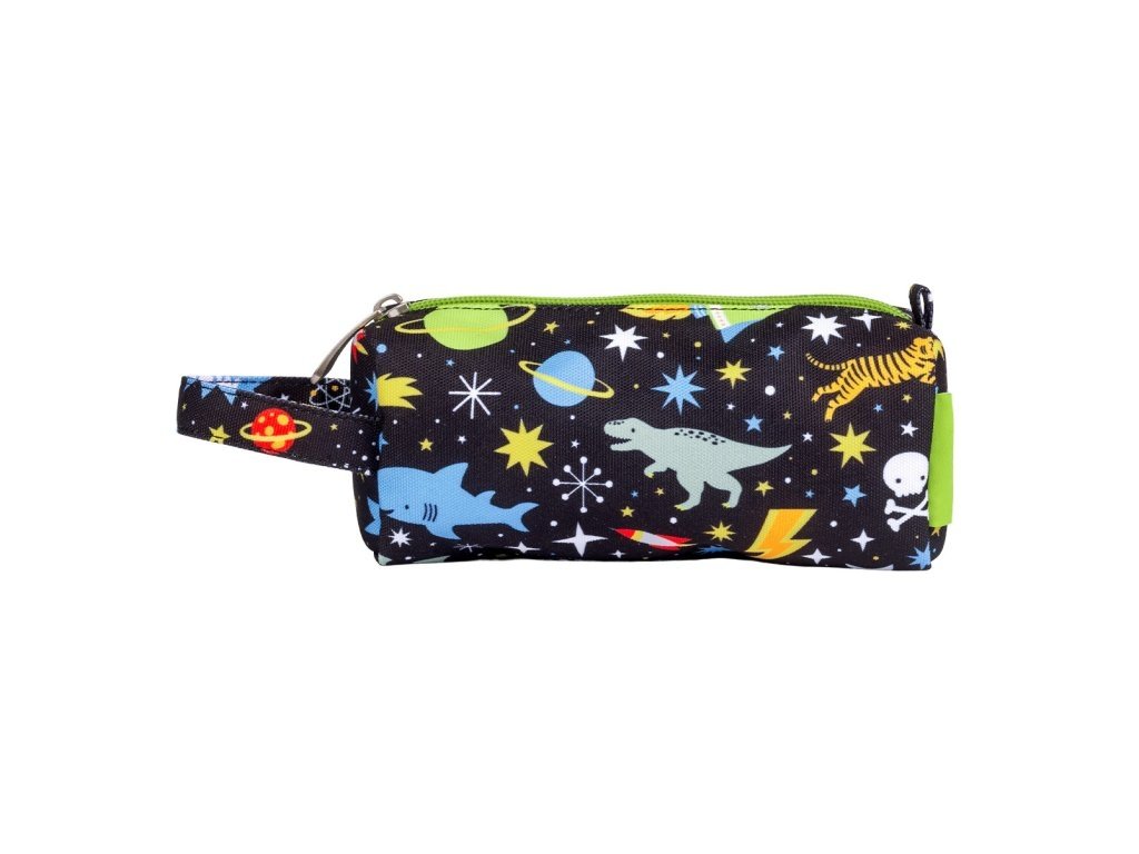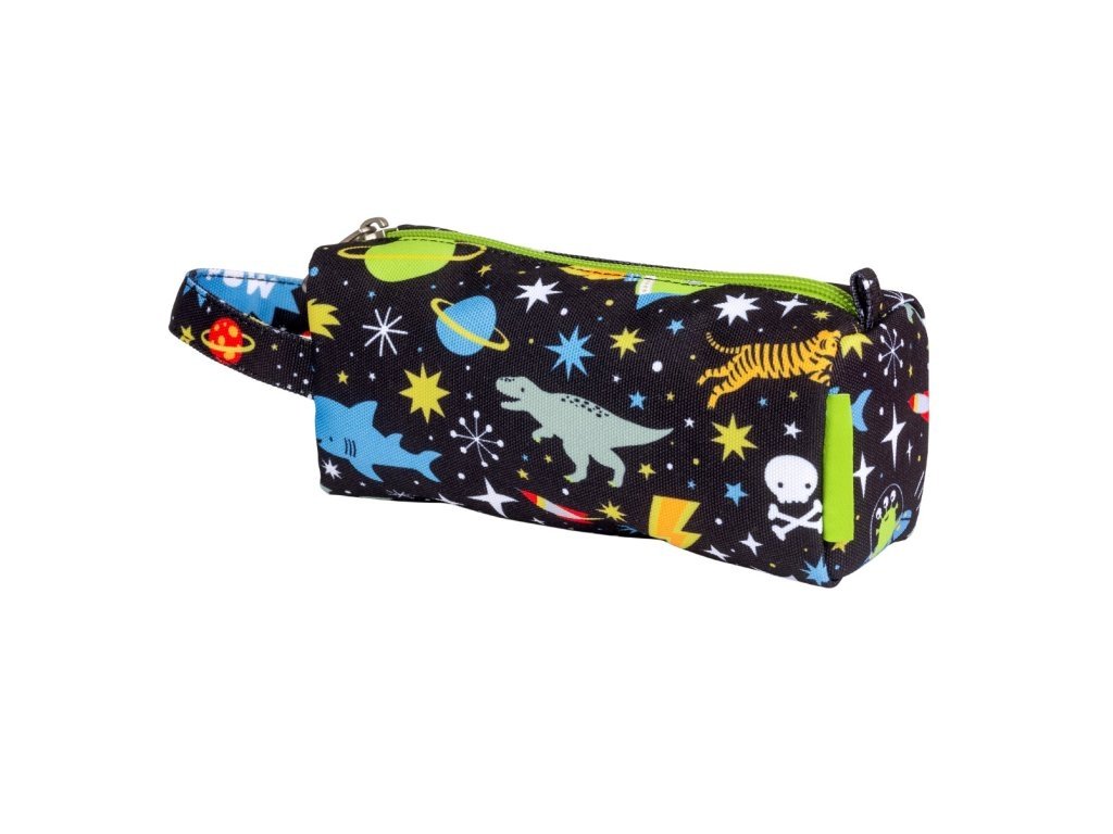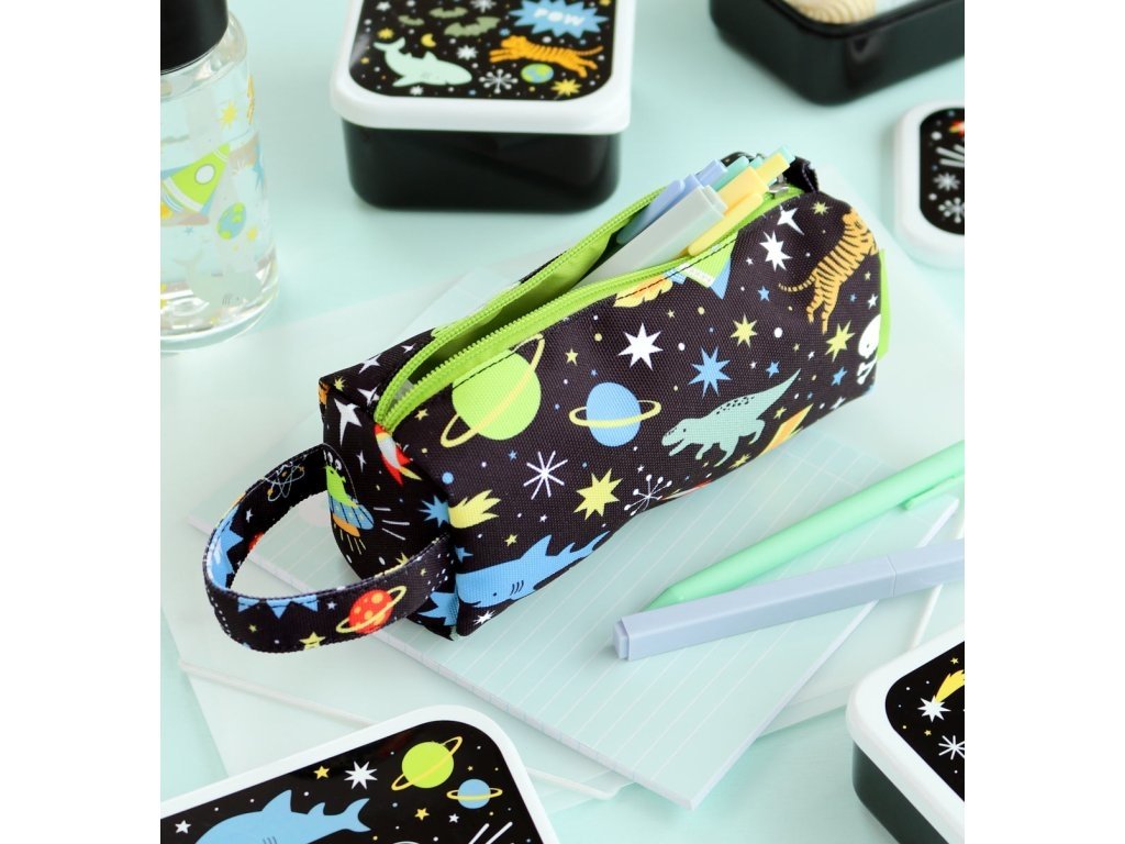 Černé pouzdro na pastelky, fixy nebo psací potřeby s raketami, planetami a hvězdami je vyrobené z udržitelného polyesteru. Je ideální na cesty, na nošení do školy nebo na kroužky. Pouzdro se zapíná na zip, je podšité a má pohodlnou rukojeť. Tento skvělý penál udrží všechna vaše pera a tužky bezpečně na jednom místě.