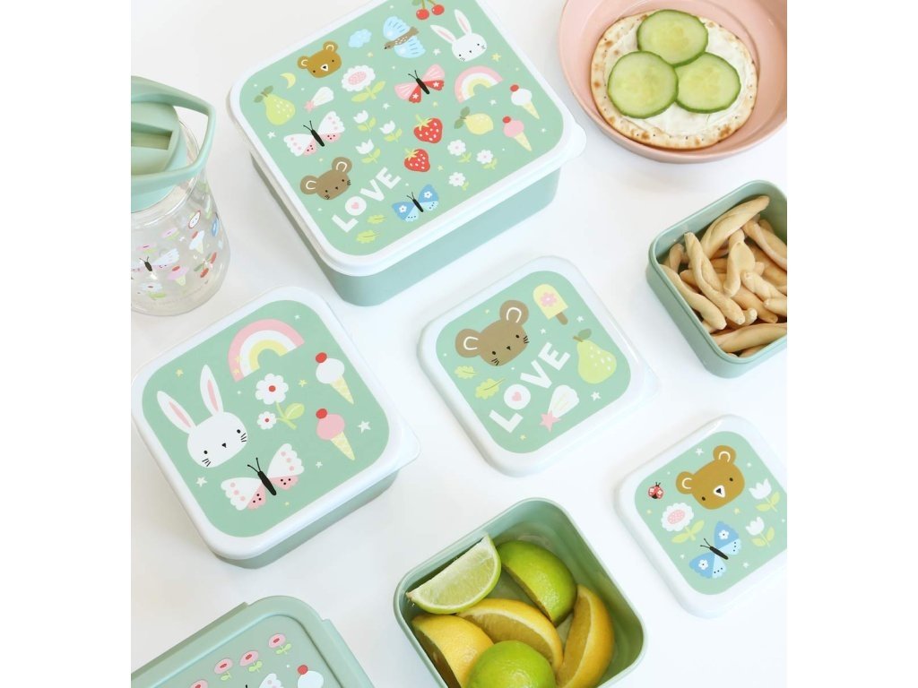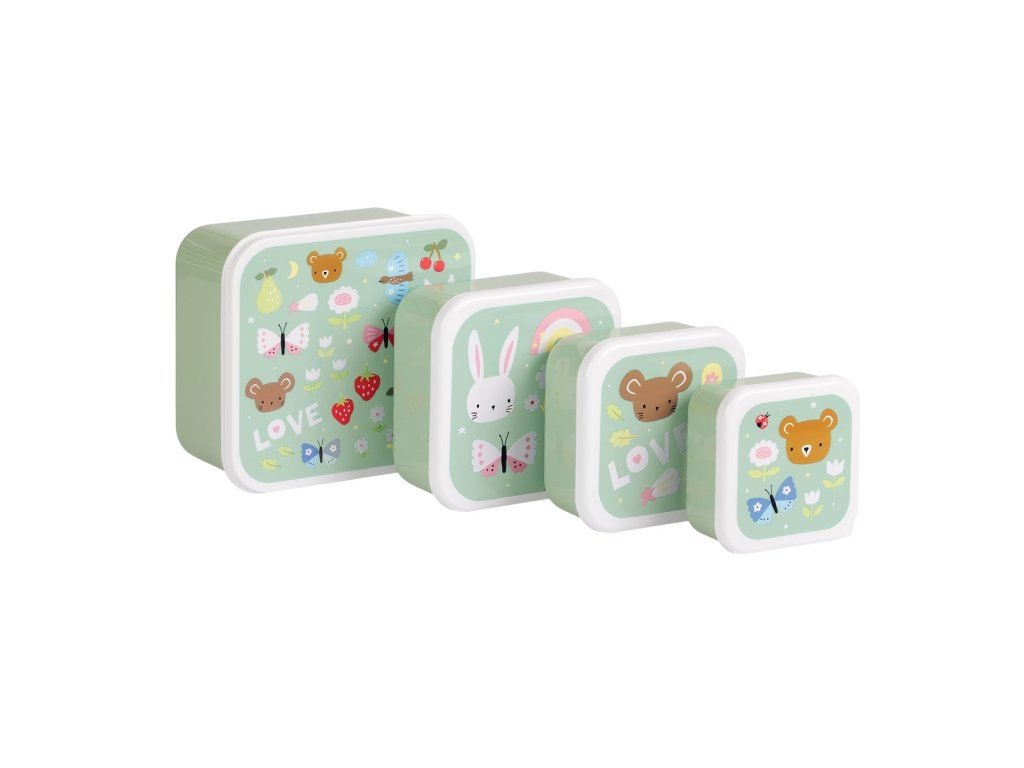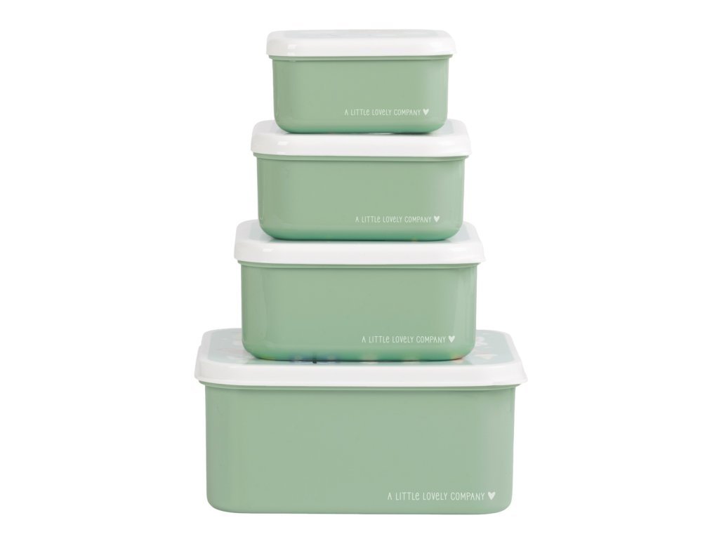 Sada čtyř krabiček na oběd a svačinu ve čtyřech různých velikostech. Krabičky mají stejný design s veselým potiskem. Krabičky se snadno otevírají a zavírají a lze je stohovat do sebe pro pohodlné skladování.