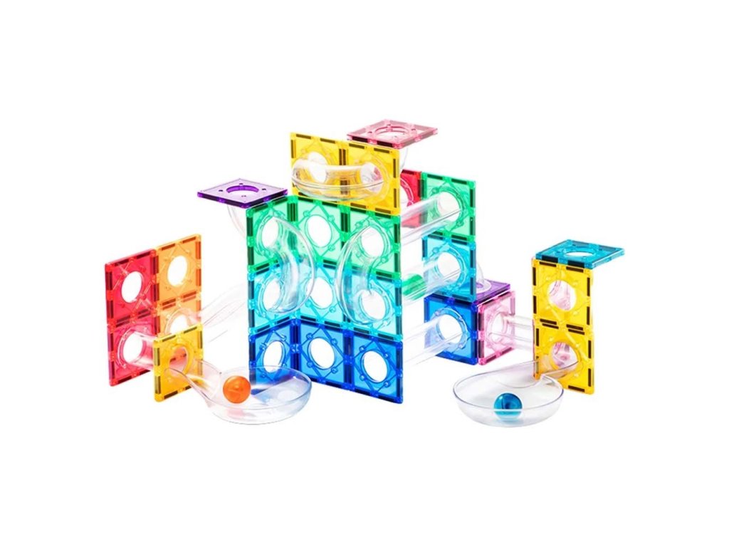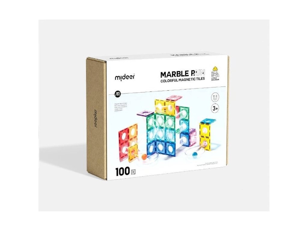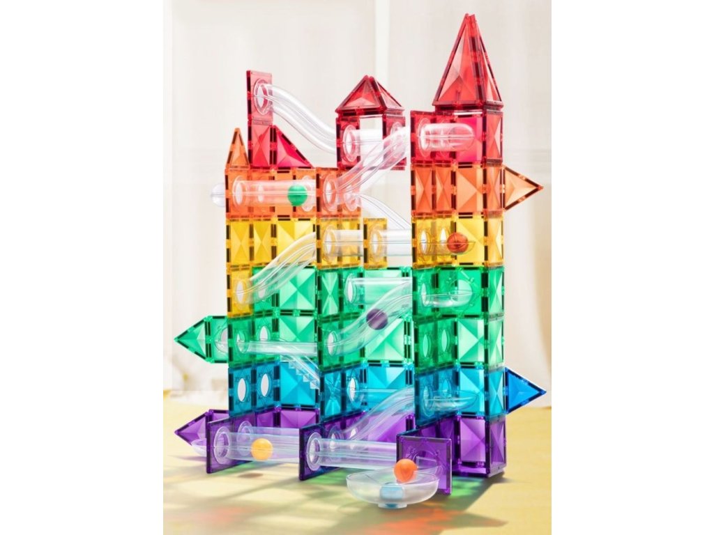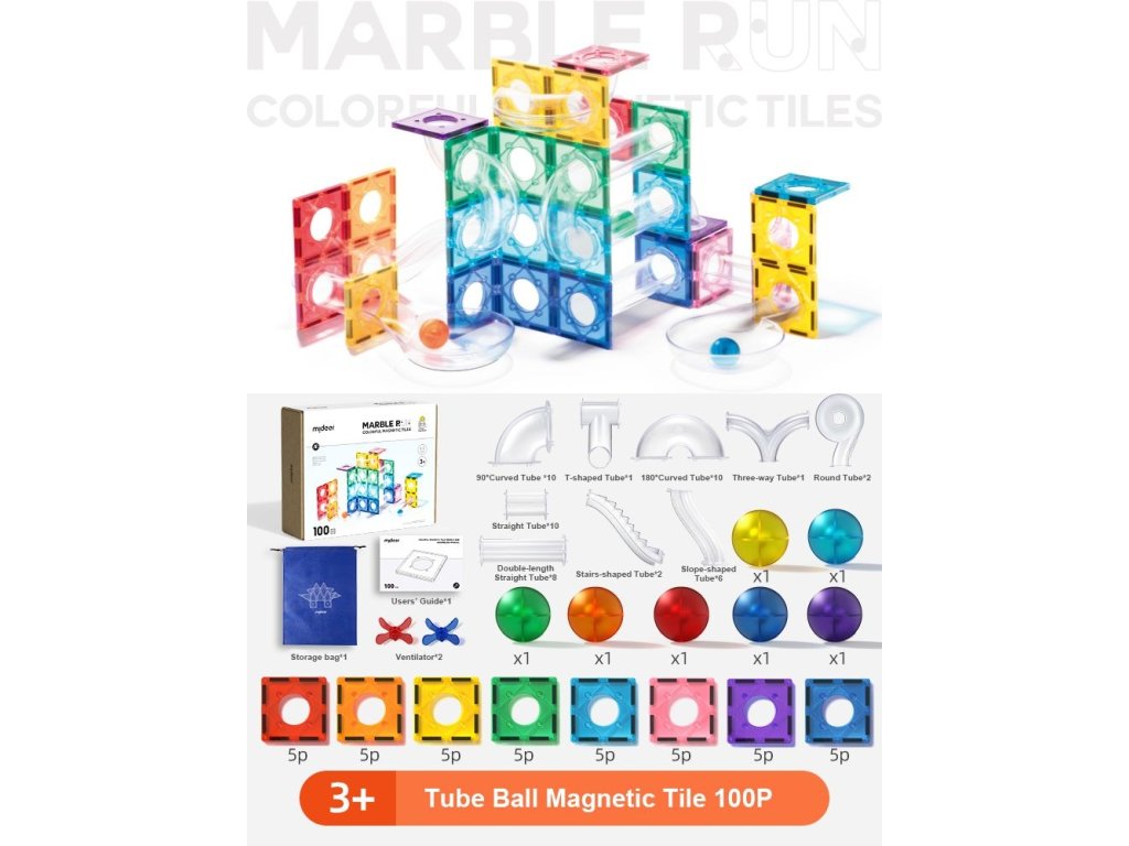 Barevná magnetická kuličkodráha (100 ks) nabízí dětem možnost stavět vlastní dráhy, po kterých se kuličky pohybují díky gravitaci. Kombinace magnetických stavebních dílků a průhledných tubusů umožňuje vytvářet rovné úseky, zatáčky, sjezdy i složitější konstrukce ve 2D i 3D prostoru.