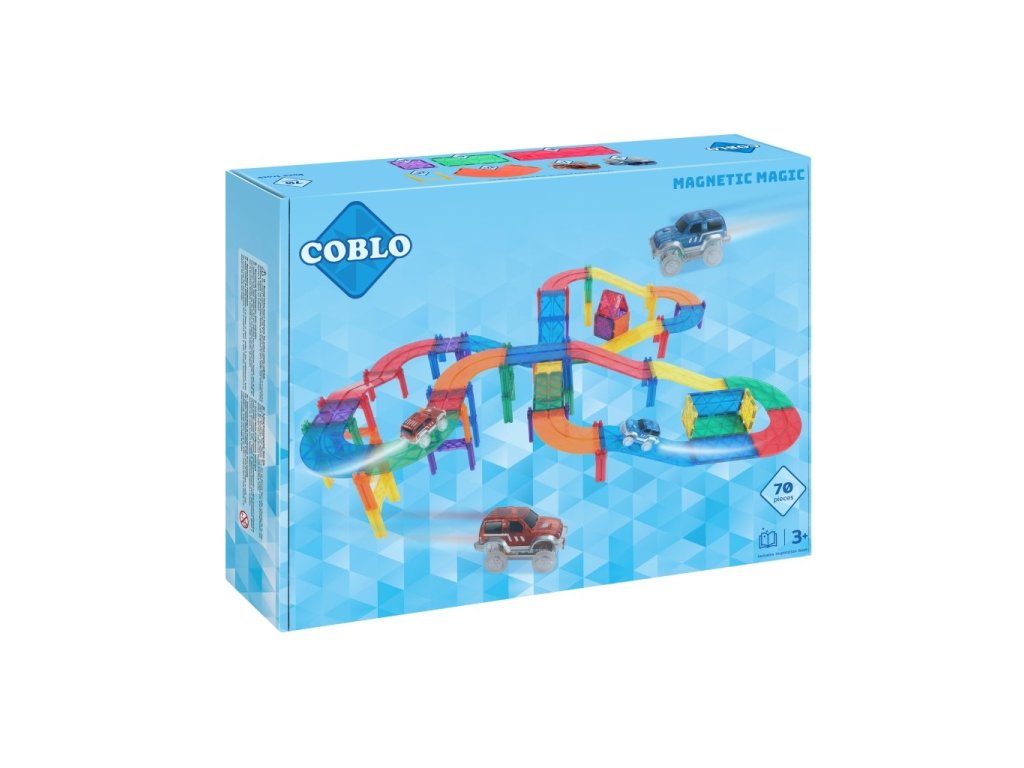 Dílky obsahují magnety, takže je děti mohou snadno samy zacvaknout a autíčka jezdí (na baterie) samostatně po dráze. Závodní dráhu lze také zábavně kombinovat s ostatními sadami Coblo, s nimiž si děti mohou postavit například vesnici nebo viadukt nad závodní dráhou.