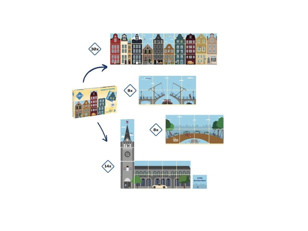COBLO – Magnetické městečko malý Amsterdam – 60 dílů přináší nový rozměr do světa magnetických stavebnic. Díky této sadě mohou děti proměnit své stavby v živoucí města. Magnetické karty se snadno připevnění k dílkům stavebnice COBLO. Tímto způsobem mohou děti vytvářet různé domy a městské části, čímž rozvíjejí svou prostorovou představivost a logické myšlení.