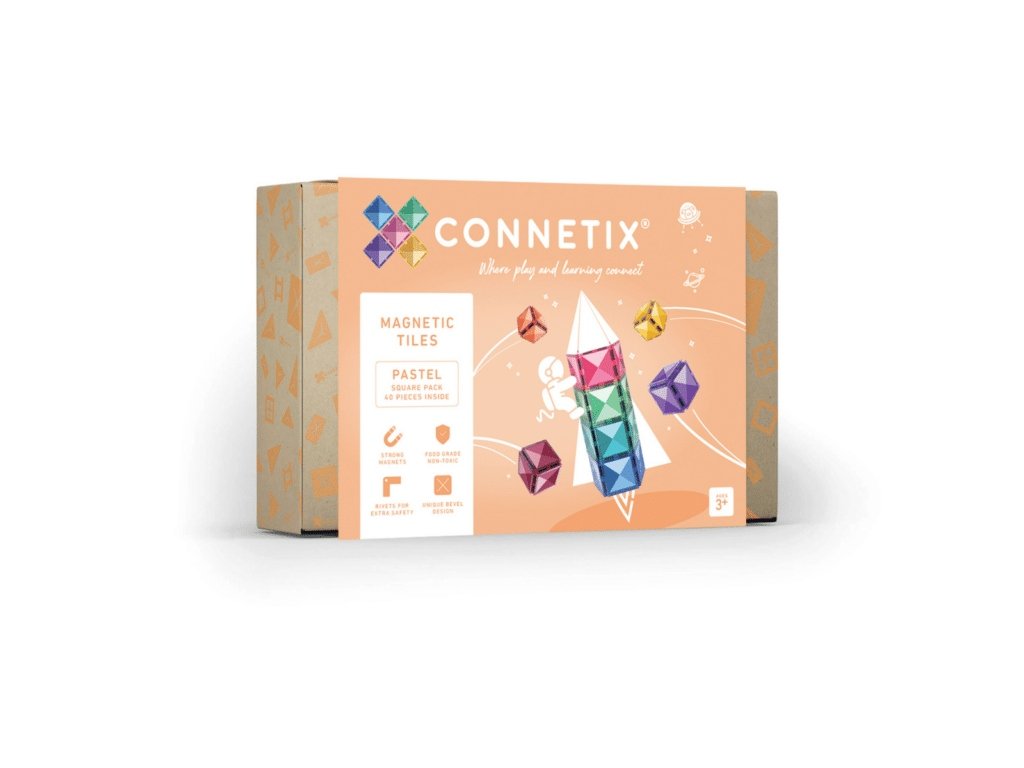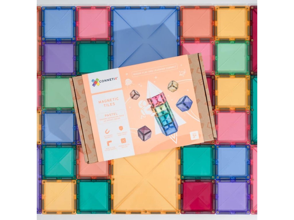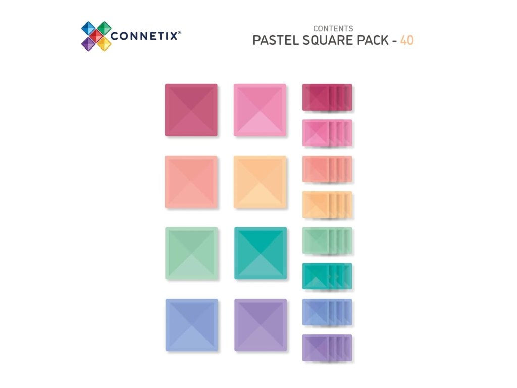 Sada obsahuje 40 malých magnetických čtverců v osmi jemných pastelových odstínech. Perfektně doplňuje jakýkoli Connetix set, umožňuje stavět větší a pevnější konstrukce a zároveň dává prostor pro tvoření barevných vzorů i detailních prvků.