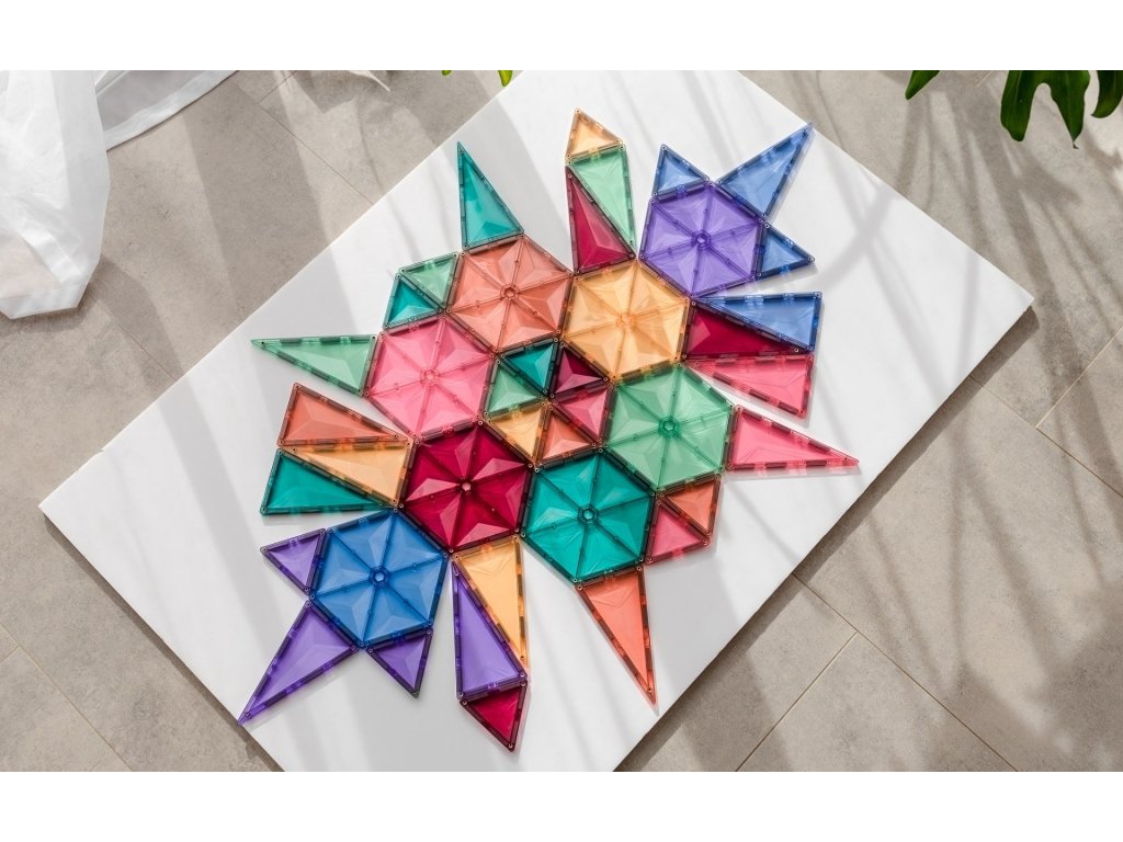 Connetix Tiles – Geometry PASTEL (40 ks) je speciální sada, která otevírá dětem cestu do fascinujícího světa geometrie. Obsahuje 40 magnetických dílků v jemných pastelových odstínech – od růžové přes mátovou až po safírovou. Děti v ní najdou trojúhelníky, čtverce i speciální polygonální tvary, díky nimž mohou stavět hvězdy, mandaly, kaleidoskopické vzory nebo rozšířit své 3D stavby o nové detaily.