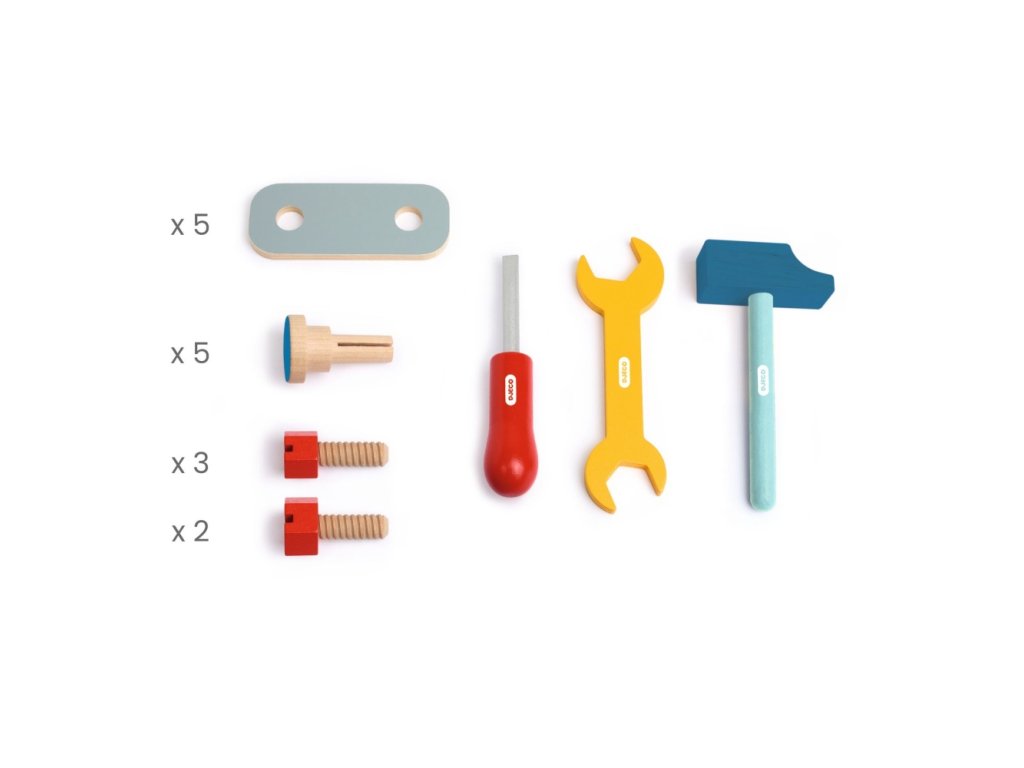 Sada obsahuje 22 dílů nářadí – kladívko, pilku, šroubovák, klíč, pravítko, matice, šrouby a další doplňky, které lze připevňovat k pracovní desce pomocí otvorů. Díky bezpečnému provedení a robustní konstrukci je hra nejen zábavná, ale i zcela bezpečná.