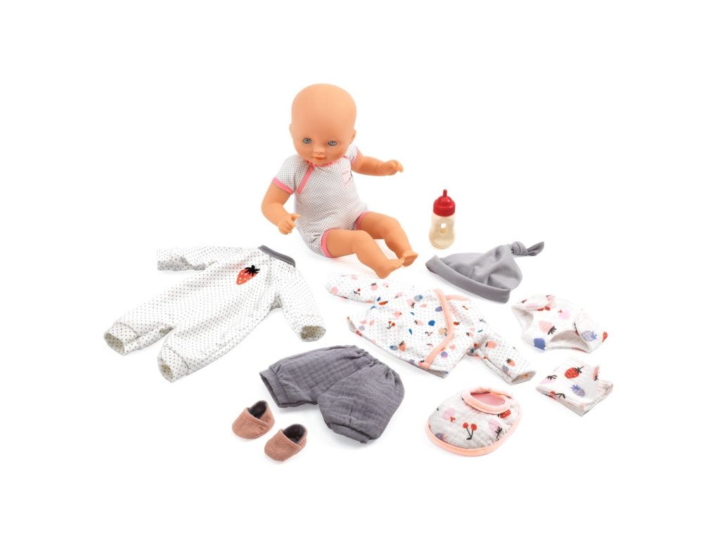 - Sada obsahuje: 1 kufřík, 1 panenku o velikosti 32 cm (s měkkým látkovým tělem a vinylovou hlavou, rukama a nohama), 1 pyžamo, 1 klobouček, 1 zavinovací top, 1 kalhotky, 1 pár botiček, 1 plenku, 1 ubrousek, 1 láhev na krmení a 1 bryndáček.