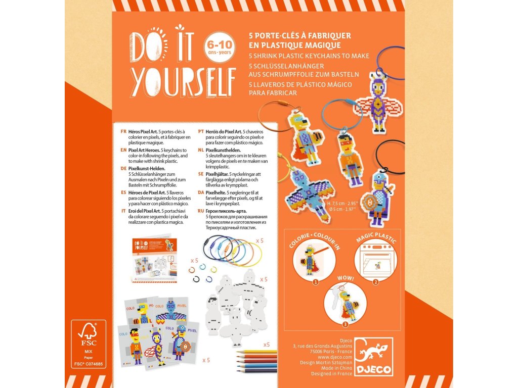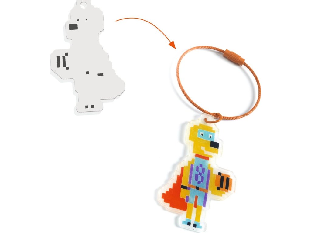 Tato kreativní sada umožní dětem vytvořit 5 originálních přívěsků na klíče ve stylu Pixel Art pomocí smršťovací fólie. Stačí položit šablonu pod průhledný tvar, vybarvit podle předlohy přiloženými pastelkami a vložit do trouby. Během pár minut se plast zmenší, zesílí a ztvrdne – a kouzlo je na světě! Hotové obrázky se pak jednoduše připevní na barevné kroužky.