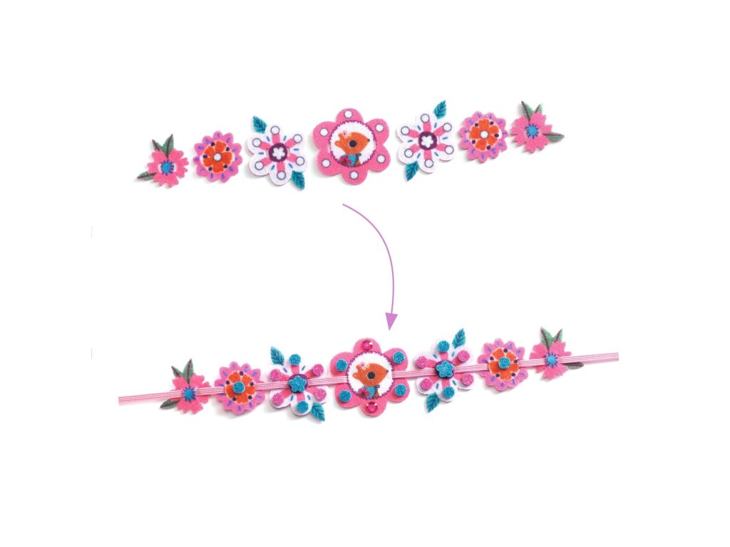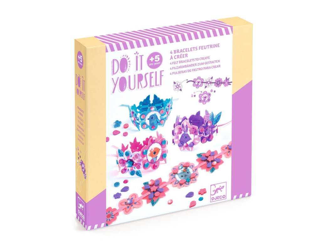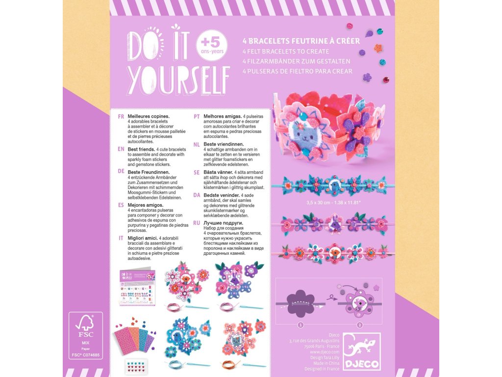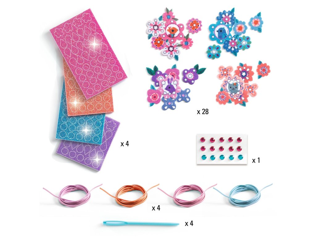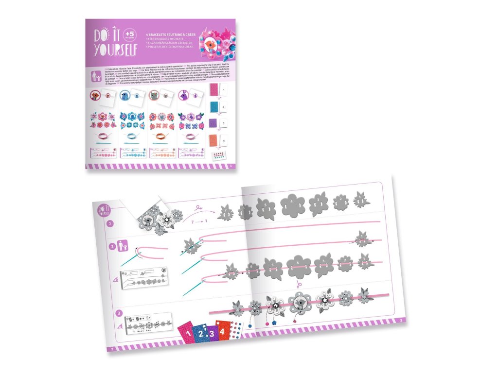Sada obsahuje: 28 předpřipravených plstěných kusů (7 pro každý náramek), 4 barevné gumičky, 4 archy třpytivých samolepek, 1 arch samolepicích kamínků, 4 kulaté plastové jehly, návod krok za krokem a 4 šablony pro každý náramek. Rozměry balení: 20 × 20 × 3,5 cm. Kartonový obal vyroben z papíru s certifikací FSC.