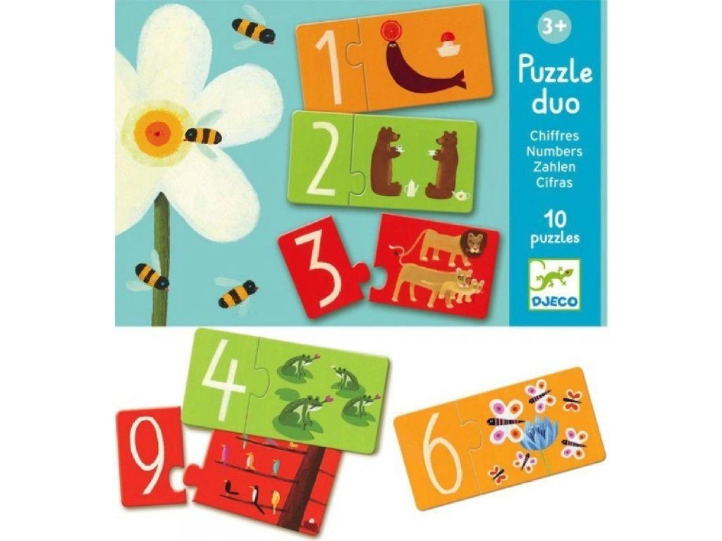Duo puzzle Čísla od Djeco pomáhají dětem porozumět základům matematiky hravou formou. Každé puzzle spojuje číslici s odpovídajícím počtem zvířátek. Děti se učí počítat, poznávat čísla a zároveň procvičují logické myšlení i jemnou motoriku. Veselé ilustrace zvířátek dělají z učení zábavu, ke které se děti rády vracejí.