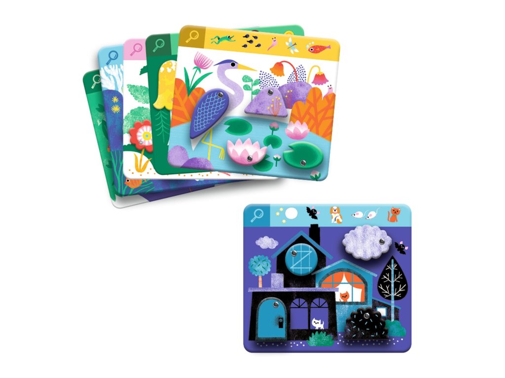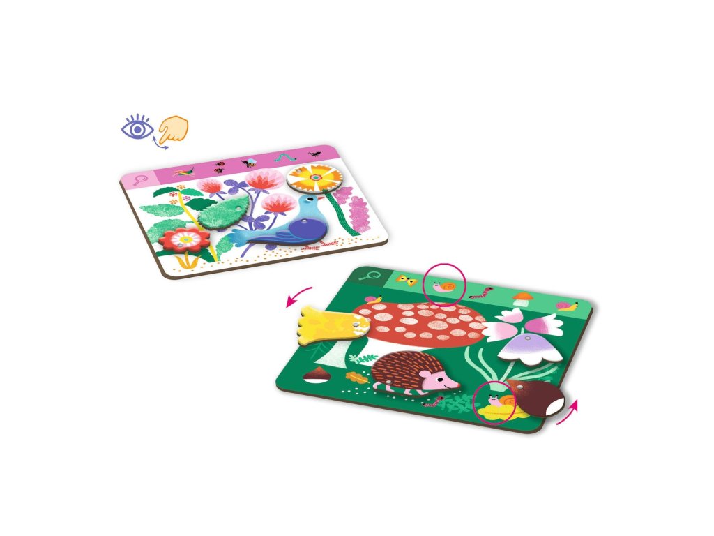 Obsah hry: 6 obrázkových destiček s pohyblivými částmi. Vyrobeno z papíru a kartonu s certifikací FSC. Rozměry balení jsou 22 x 21,5 x 4,5 cm.