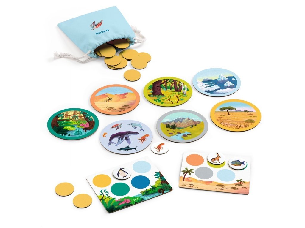 Obsah: 6 bingo desek, 7 karet přírodního prostředí, 49 žetonů zvířat a 1 látková taška. Pravidla hry v 10 jazycích.