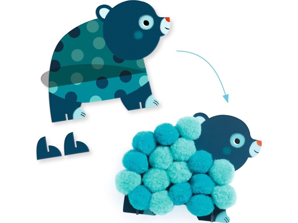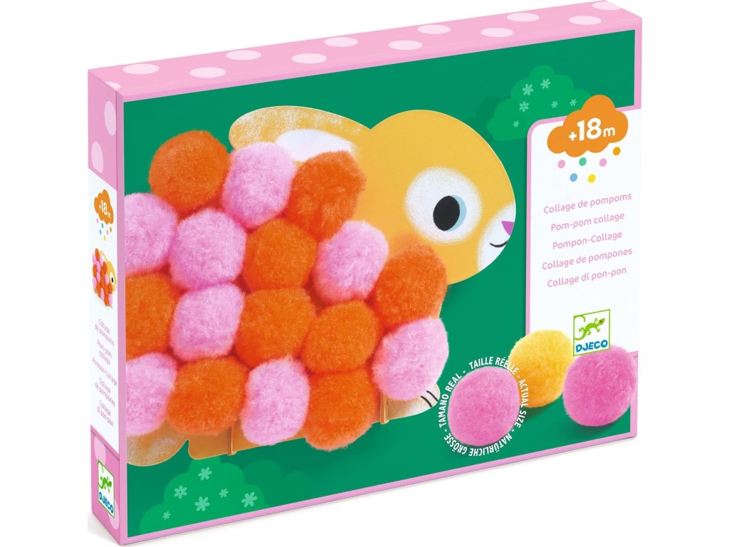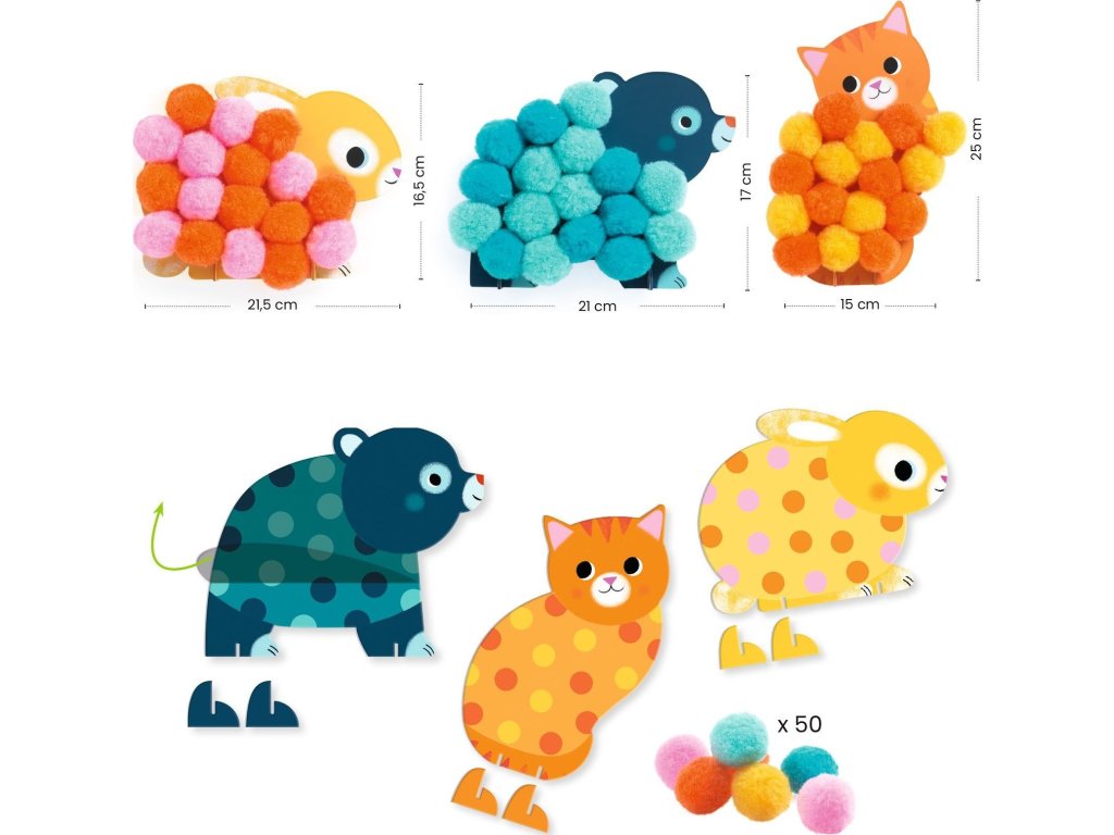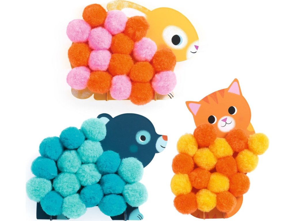 DJECO Koláže s bambulkami – Zvířátka jsou ideální první výtvarnou aktivitou pro malé děti. Sada obsahuje předlohy s motivy zvířátek a barevné měkké bambulky, které děti lepí na vyznačená místa. Díky tomu vznikají krásné plastické obrázky plné barev a radosti.