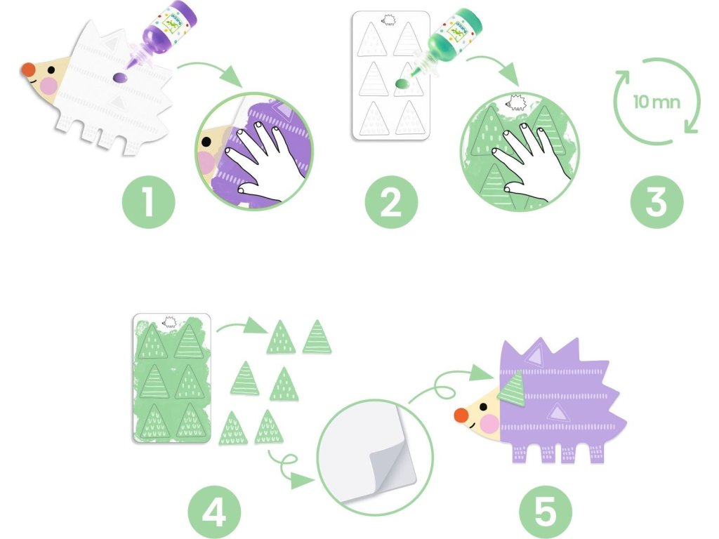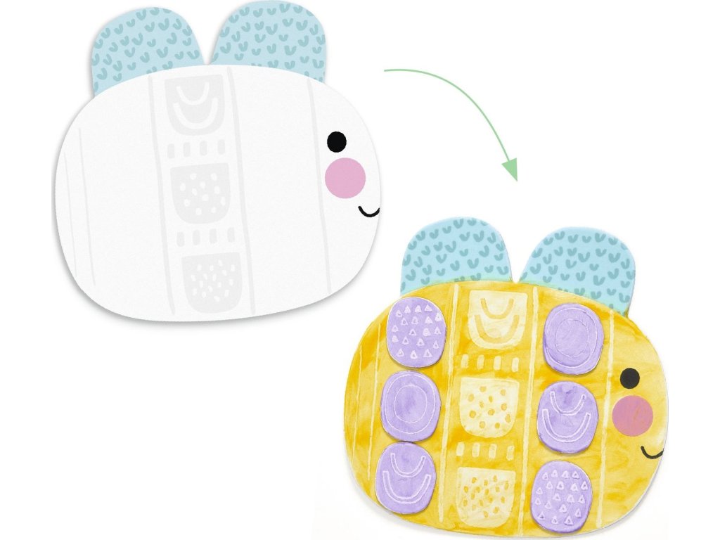 Tvořivá sada, se kterou děti od 18 měsíců objeví kouzlo prstových barev. Stačí pár kapek barvy a na zvířátkách se začnou objevovat kouzelné vzory. Nakonec je mohou děti ozdobit samolepkami a dodat jim ještě roztomilejší vzhled. Sada obsahuje i praktickou papírovou podložku, takže tvoření je snadné a bez nepořádku. Skvělý způsob, jak se hravou formou seznámit s barvami a tvary.