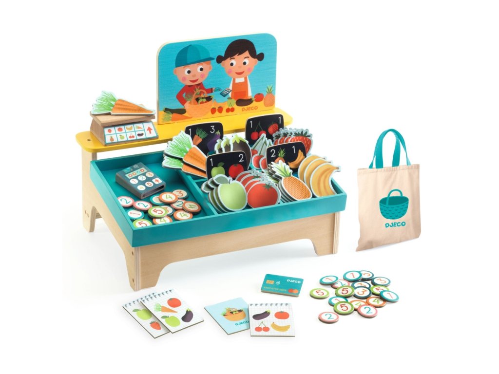 Interaktivní dřevěná hračka od značky Djeco, která umožňuje dětem od 3 do 6 let hrát si na obchodníky. Sada obsahuje dřevěné ovoce, zeleninu, pokladnu a další doplňky, které podporují rozvoj sociálních dovedností a představivosti. Vhodné pro hraní ve dvojici nebo skupině.