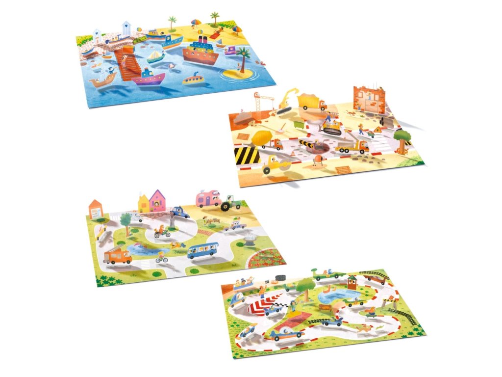 čtyři velké panoramatické ilustrace s prostředím (silnice, letadla, lodě, auta a další),