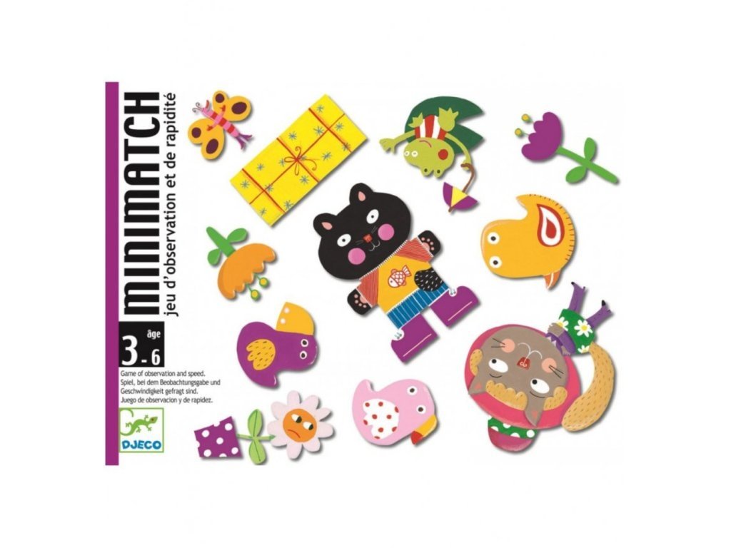 DJECO Malý závod – máš postřeh? (Minimatch) je dynamická postřehová karetní hra ideální pro děti ve věku 3–6 let, vhodná pro 2 až 5 hráčů. Hra rozvíjí zrakové vnímání, rychlost a pozornost zábavným způsobem, kdy děti musí co nejrychleji najít obrázek na své kartě shodný s obrázkem na “mixové” kartě uprostřed stolu. Při chybě následuje „trest“ – hráč si vezme dvě karty navíc.