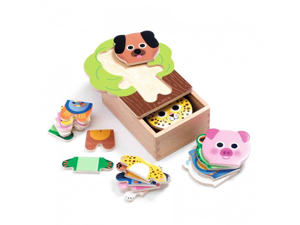 DJECO Namixuj zvířátka je zábavná dřevěná skládačka, která umožňuje dětem vytvářet vlastní zvířátka nebo skládat zvířátka podle předlohy. Tato skládačka obsahuje 6 barevných zvířátek, z nichž každé je složeno ze 3 dřevěných dílků. Děti si mohou na víku krabičky poskládat postavičky podle vlastního výběru, jako například leoparda, žábu, nebo úplně nové zvířátko smíchané z různých dílků.