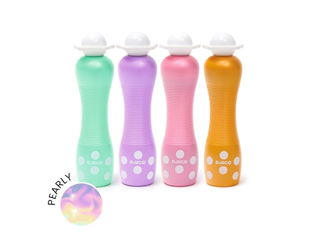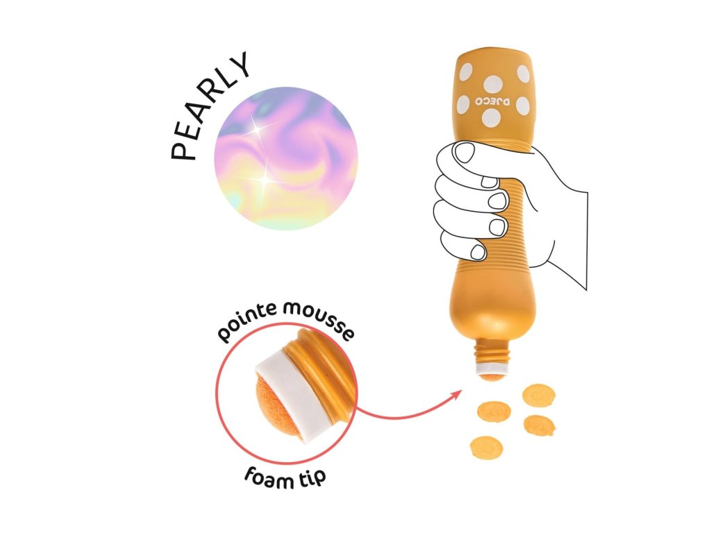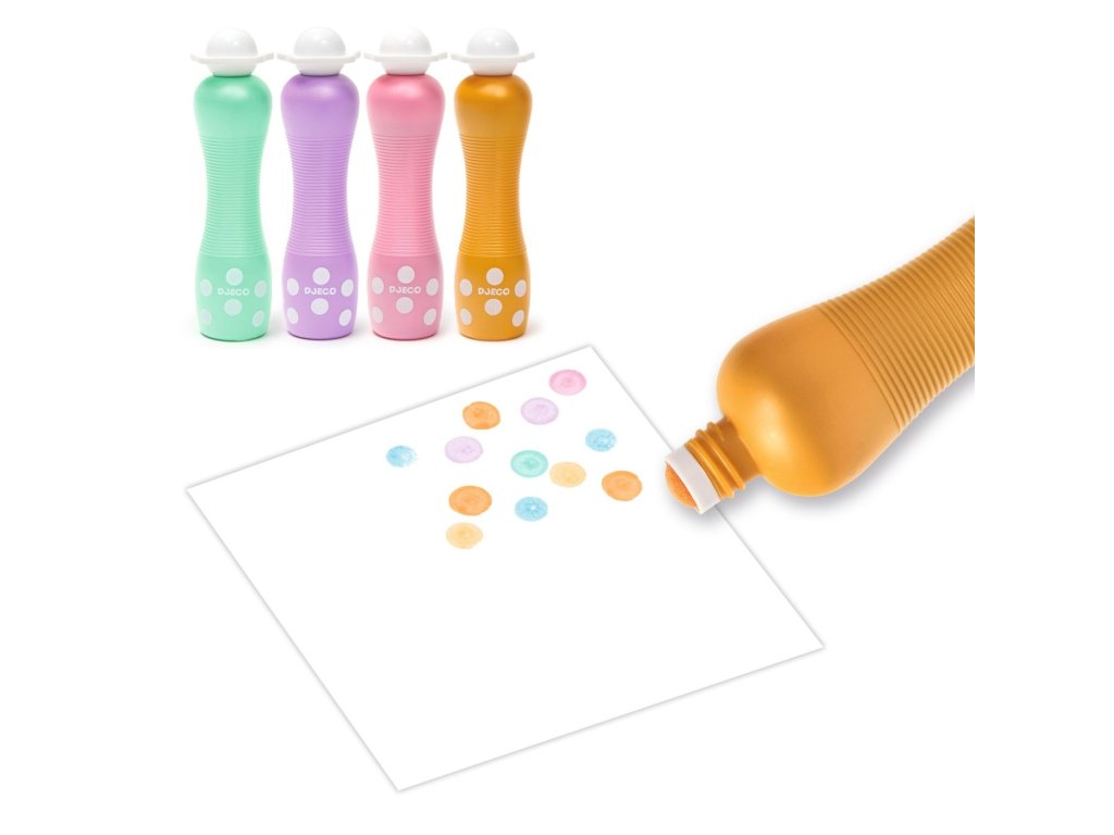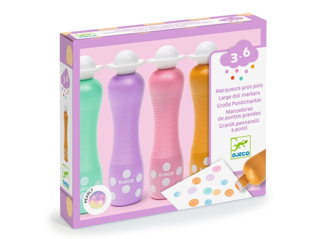 Sada 4 barev pro malé umělce od 3 let. Barvy jsou speciálně vyvinuty pro malé dětské ruce pro vytváření teček s perleťovým efektem (ve fialové, růžové, zelené a žluté barvě). Hrot, který mají barvy je kulatý a nezničí se ani při větším tlaku na špičku. Rozměry balení jsou 15 x 13 x 4 cm. Inkoust je omyvatelný.