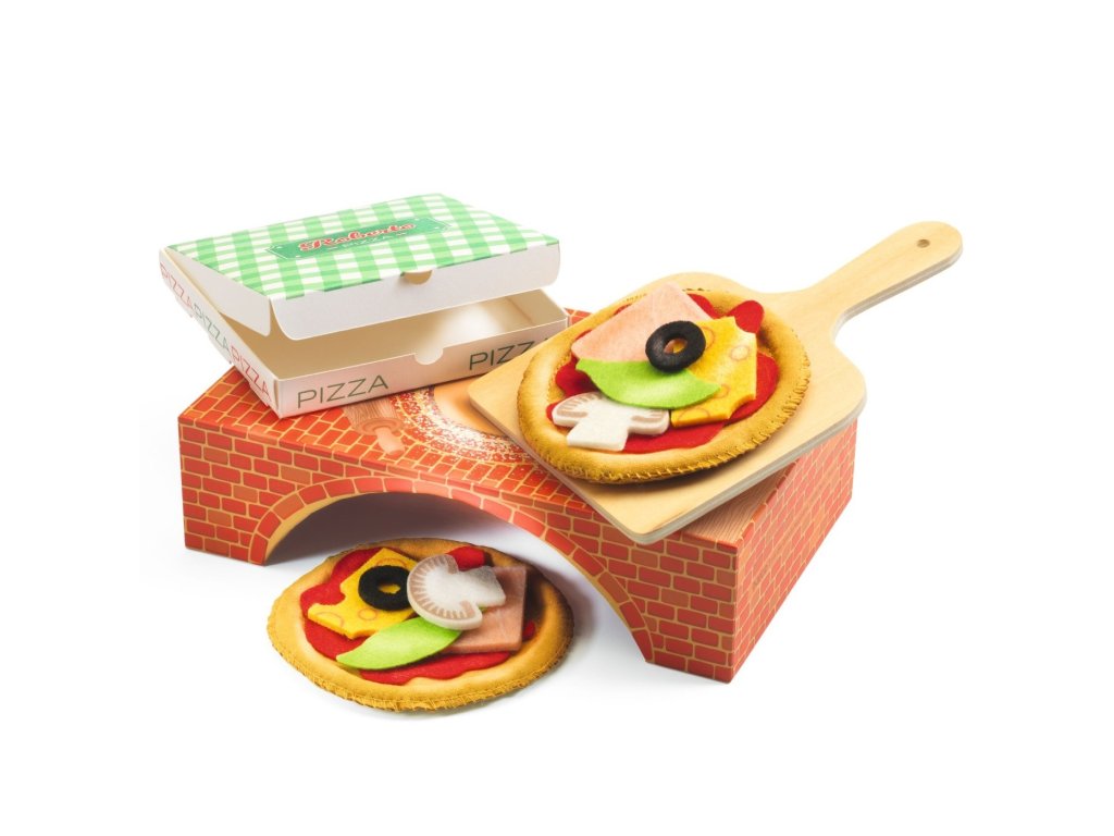 Sada je chytře navržena tak, aby poskytla kompletní zážitek z přípravy a podávání pizzy. Praktická dřevěná krabička neslouží jen k úschově, ale po otočení se promění v autentickou pec na pizzu. Děti mohou přijímat objednávky podle přiloženého menu, připravovat pizzu na semišových základech a zdobit ji bohatou sadou plstěných ingrediencí.