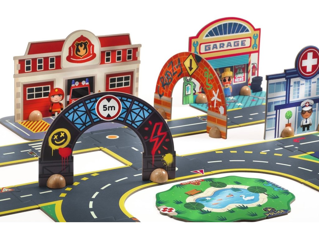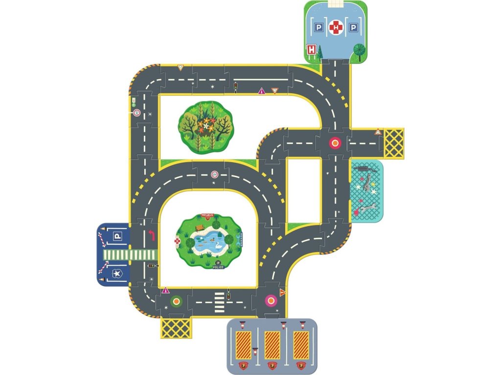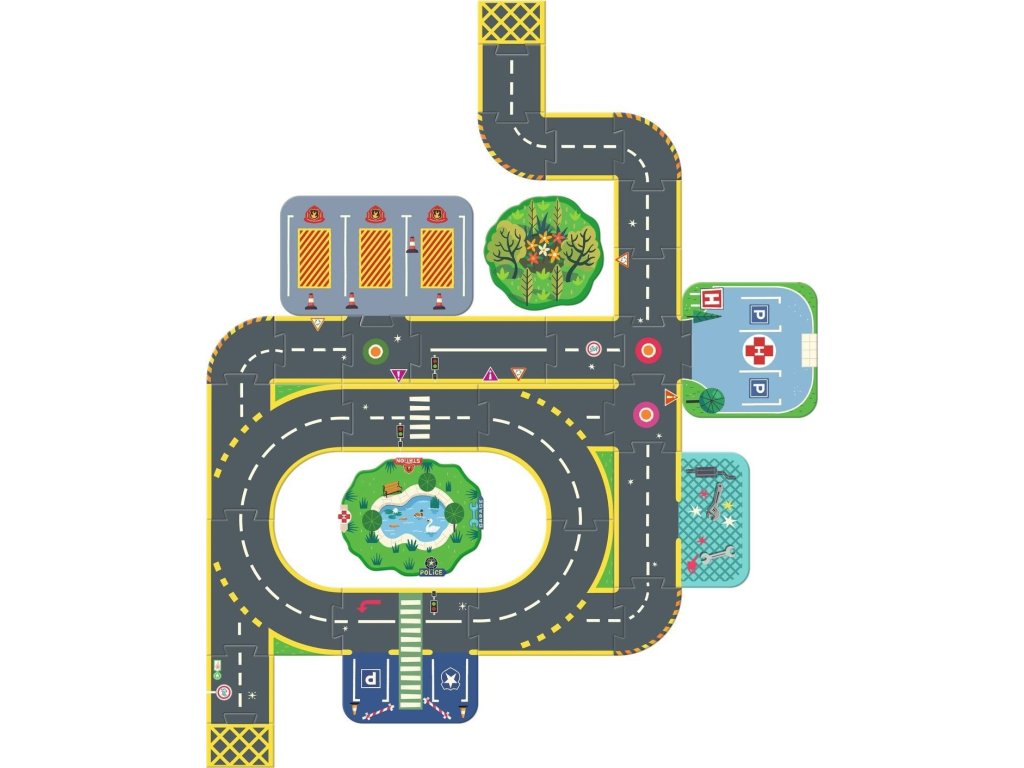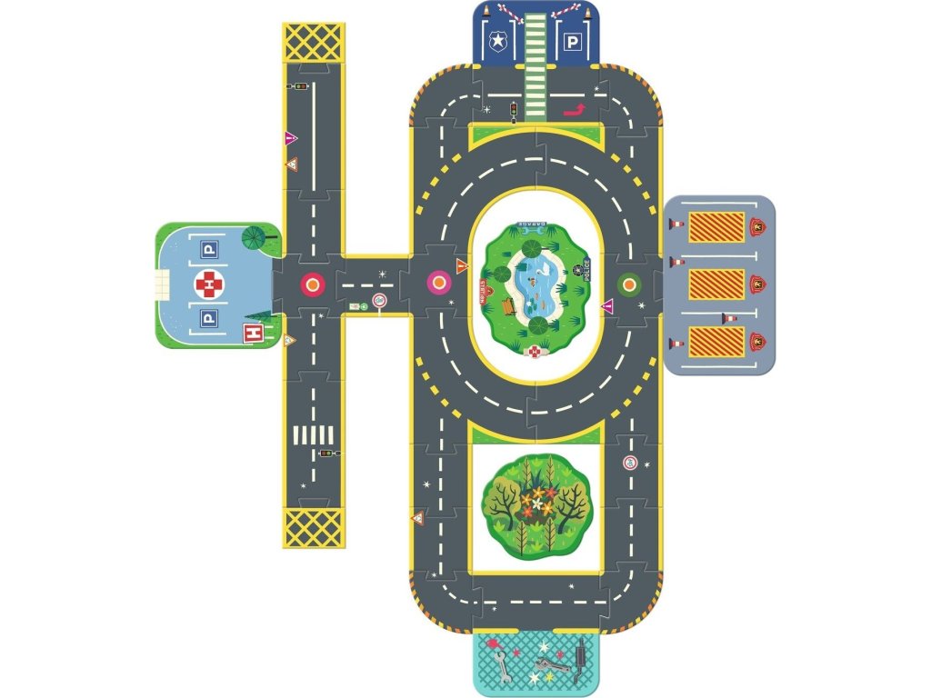 Tento obří podlahový puzzle přináší úplně nový způsob hraní: kromě klasických dílků obsahuje i vertikální prvky na dřevěných podstavcích, které vystoupí do prostoru a promění město v živou 3D scénu. Děti mohou město sestavit podle předloh, nebo zapojit fantazii a navrhnout vlastní Crazy City plné závodů, záchranářů a megarychlých aut. Puzzle je kompatibilní s ostatními dráhami Crazy Motors, takže možnosti hry jsou prakticky nekonečné.