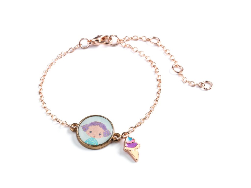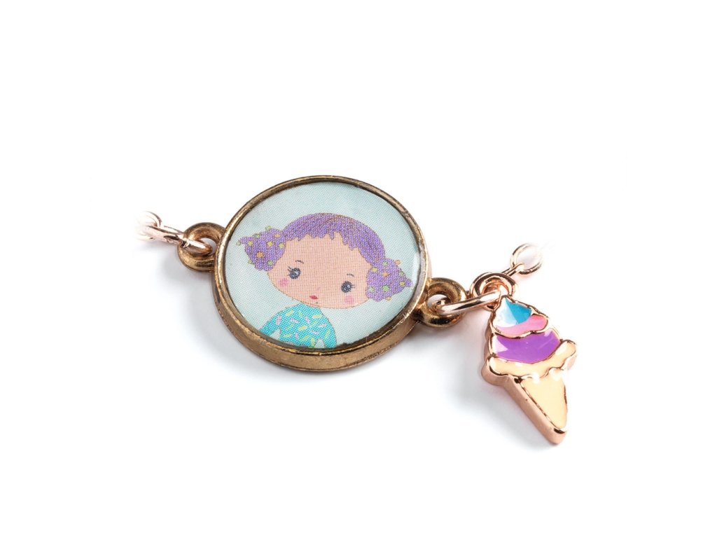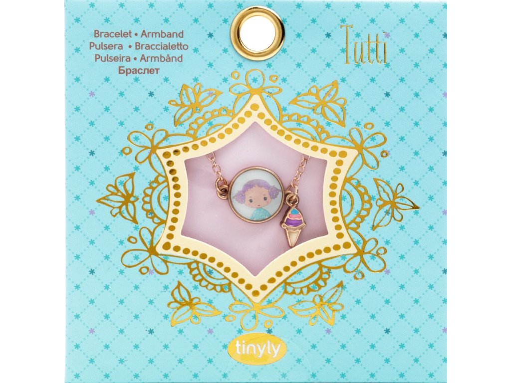 Vstupte do barevného světa Tinyly s náramkem Tutti od značky Djeco, který promění každou malou slečnu v hvězdu pohádkového dobrodružství! Tento roztomilý náramek z pozlaceného kovového řetízku zdobí medailonek s ilustrací Tutti a přívěsek ve tvaru sladké třešně – okouzlující doplněk, který přitahuje pozornost a rozveselí každý den.