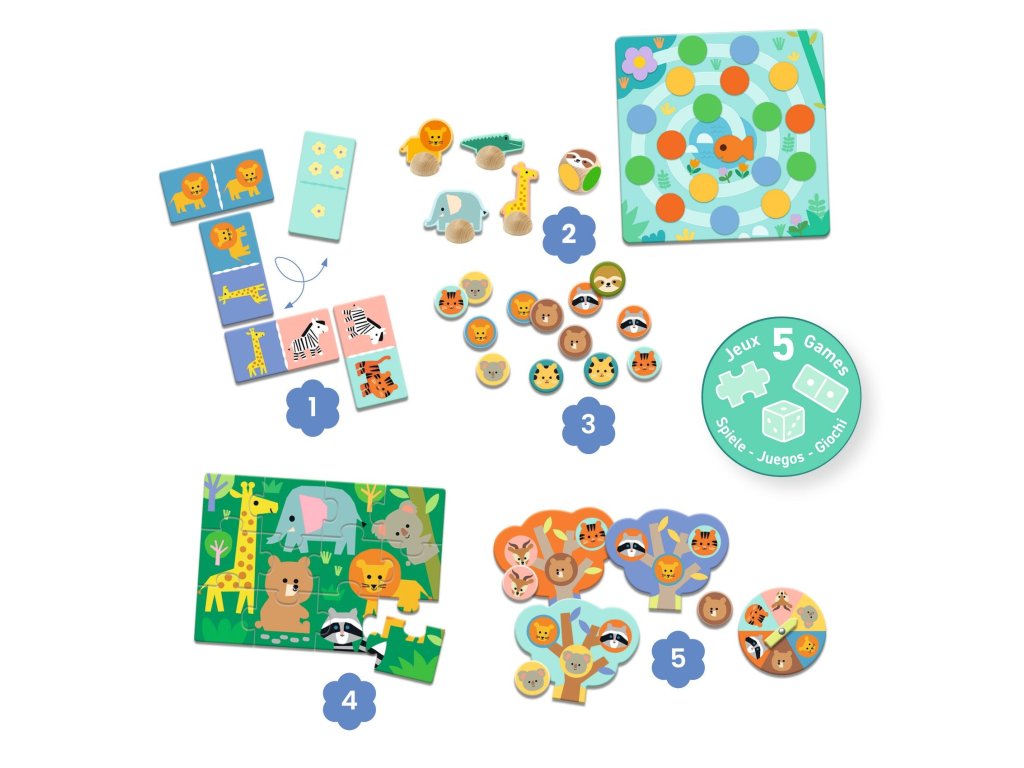 Zábavná sada her s motivem zvířátek z divoké přírody (originální název hry je Wild animals - 5 GAMES), která rozvíjí paměť, logické myšlení i postřeh. Obsahuje 5 oblíbených her v jednom balení – ideální pro společné hraní doma i ve školce. Hry jsou doporučené pro 1-4 hráče od 3 let.