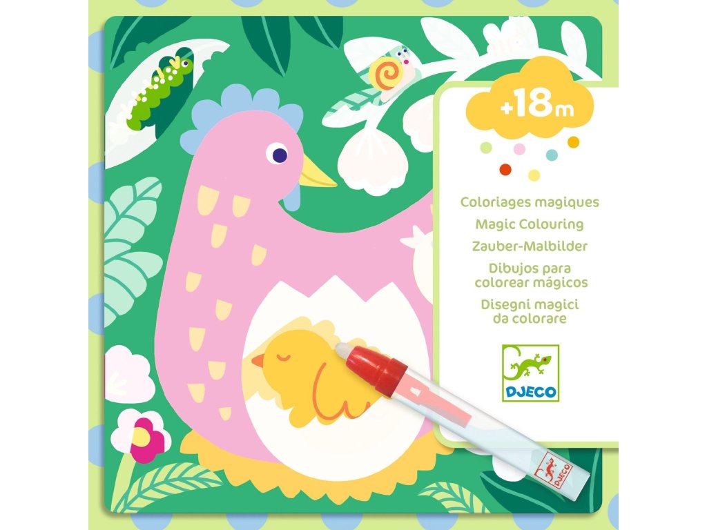 Magické vybarvování vodou je skvělá první kreativní aktivita pro děti od 18 měsíců. Stačí naplnit pero vodou a přetírat bílé plochy – pod nimi se postupně objeví roztomilá zahradní mláďátka. Jakmile obrázky uschnou, kouzlo zmizí a děti mohou začít znovu.