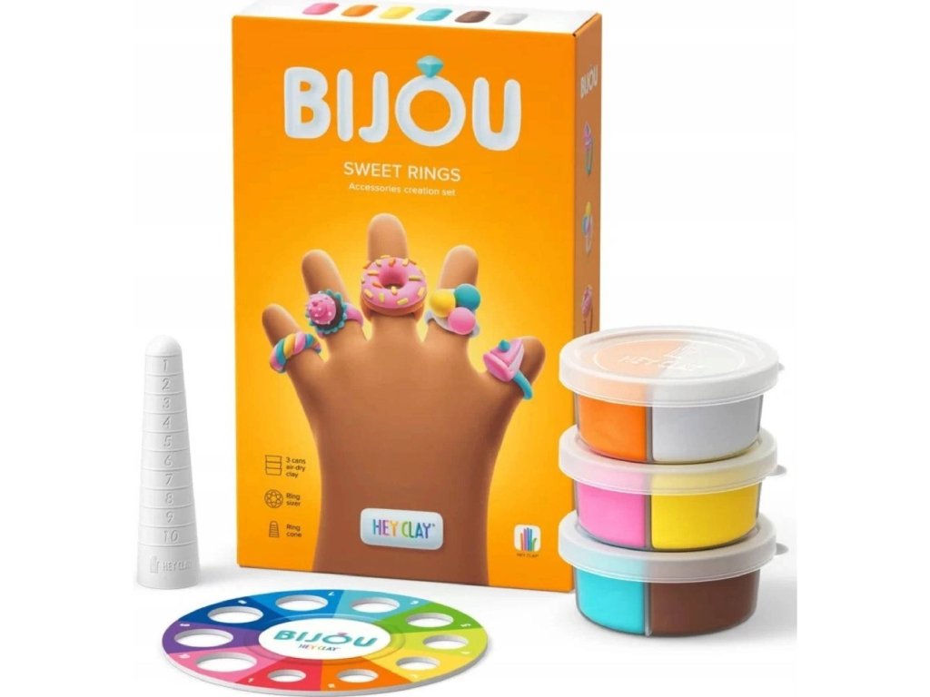 Hey Clay – Roztomilé prstýnky (Bijou, 20 ks) přináší dětem možnost stát se malými designéry a tvořit vlastní šperky — prstýnky plné barev a kreativity. Sada obsahuje modelovací hmotu a pomůcky, pomocí kterých lze vytvarovat až 5 originálních prstýnků (např. ve tvaru dezertů jako zmrzlina, dort, donut apod.). Po zaschnutí na vzduchu hmota tuhne a prstýnky lze nosit nebo použít jako dekoraci.