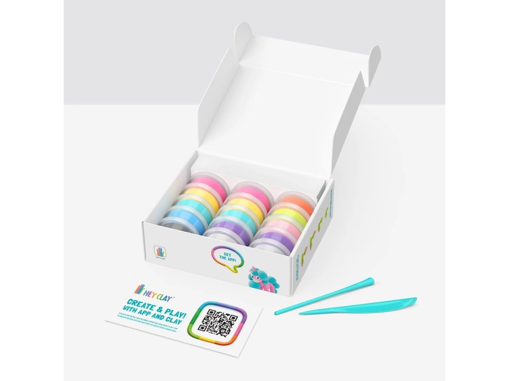 Sada Hey Clay obsahuje 15 nádob s měkkou a jemnou hmotou, dva nástroje pro usnadnění modelování a přístupový kód do aplikace pro zakoupenou sérii postav. Barvy jsou uvedeny na obalu a umožňují vytvořit ze sady všech 6 postav. Věk 3+
