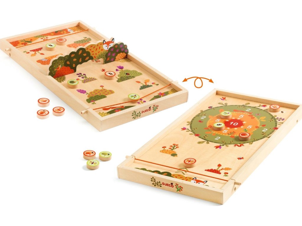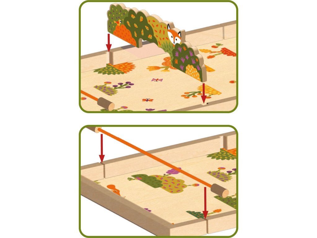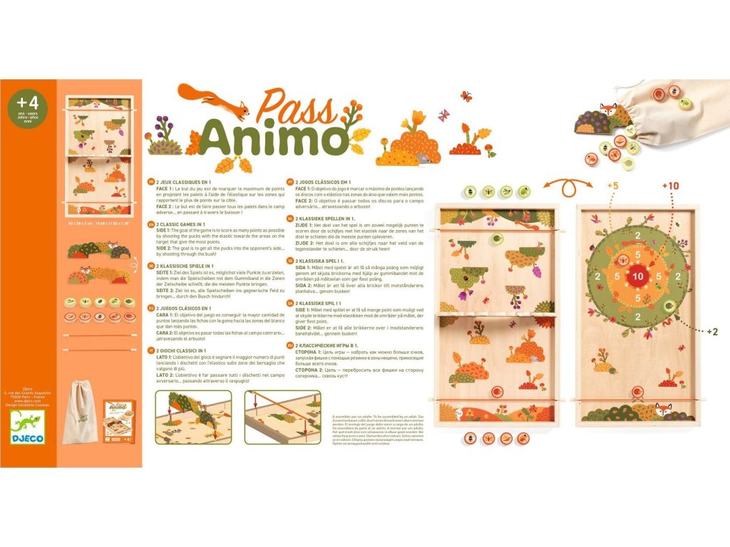 Pass Animo spojuje dvě klasické hry do jednoho velkého oboustranného dřevěného herního plánu. Děti si mohou vybrat mezi hrou na šoupání disků přes překážku nebo mířením na terče pro co nejvyšší skóre. Rychlé a svižné partie podporují spolupráci, sdílení i radost ze společné hry.