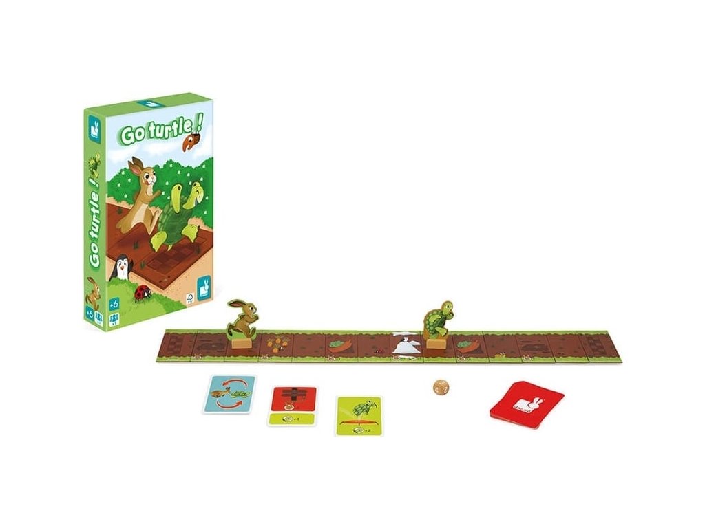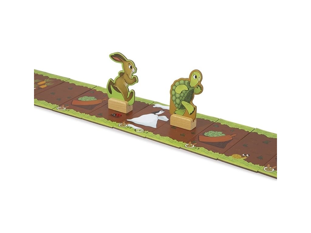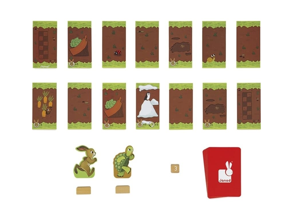 V Janod Hra pro jednoho hráče Zajíc a želva hráč převládá jako želva v závodu proti zajíci. Každé kolo si vybírá z nabídky 3 akčních karet, které mohou posunout želvu vpřed nebo ovlivnit pozici zajíce. Zajíc se pohybuje podle hodu kostkou, čímž hra nabízí kombinaci strategie i náhody. Mapa tratě obsahuje různé efekty – bonusy, penalizace či změny v pohybu. Cílem je dorazit do cílové čáry rychleji, než zajíc. Hra je vhodná pro děti od 6 let a je výbornou volbou pro samostatné hraní.