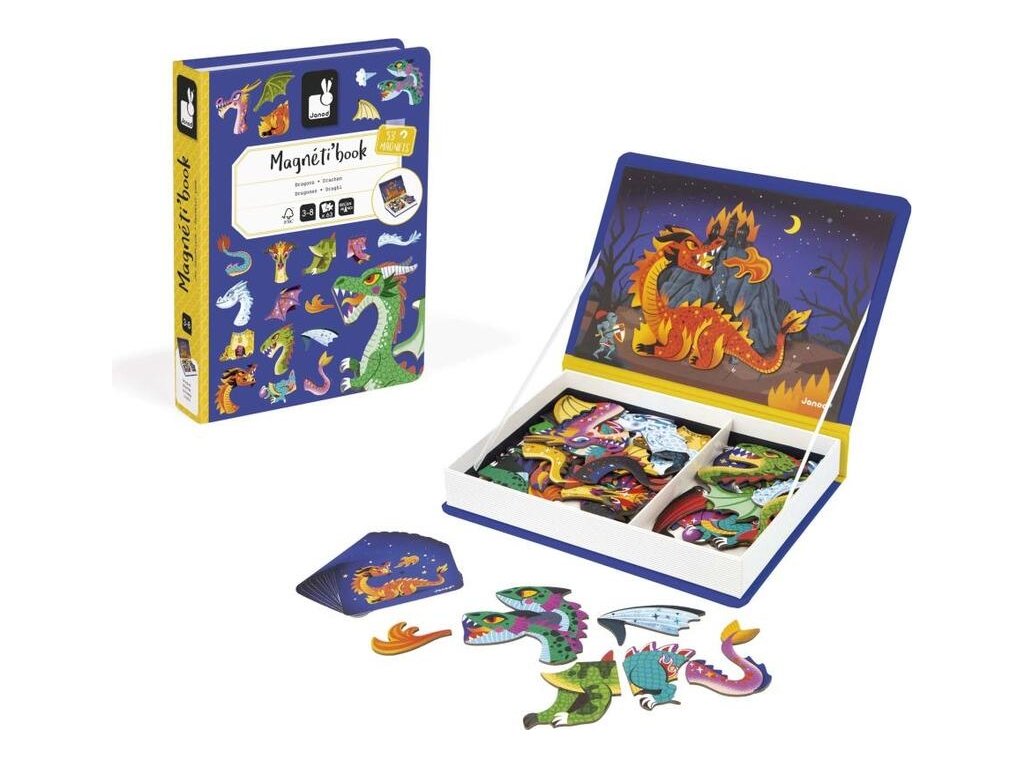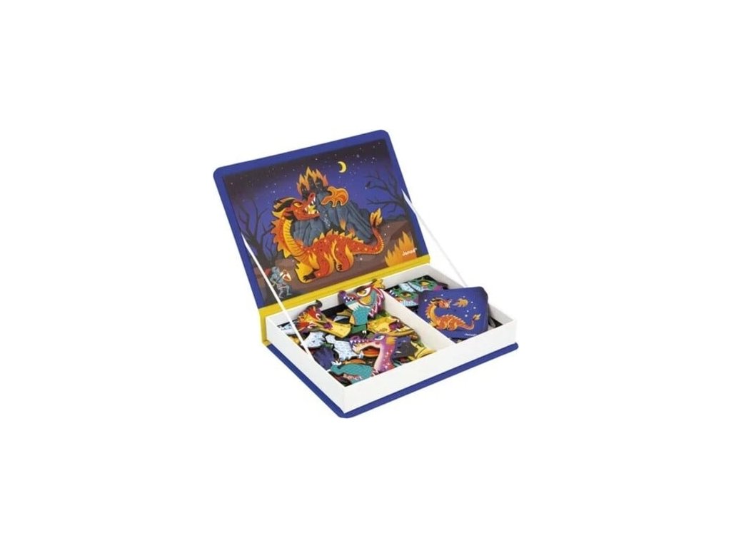 Ponořte děti do světa fantasy a středověkých příběhů s Janod Magnetibook Draci. Tato magnetická sada nabízí 53 magnetických dílků a 10 vzorových kartiček umožňujících skládat různé draky – podle inspirovaných předloh nebo podle vlastní fantazie. Hra podporuje jemnou motoriku, logické myšlení a kreativní vyprávění.