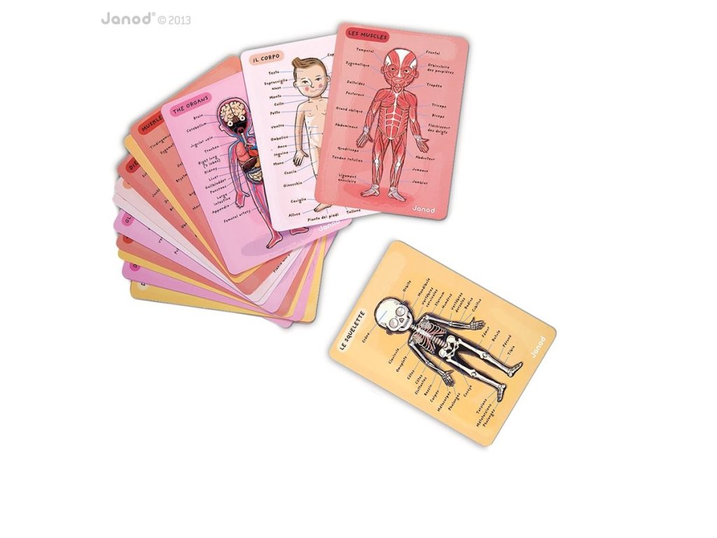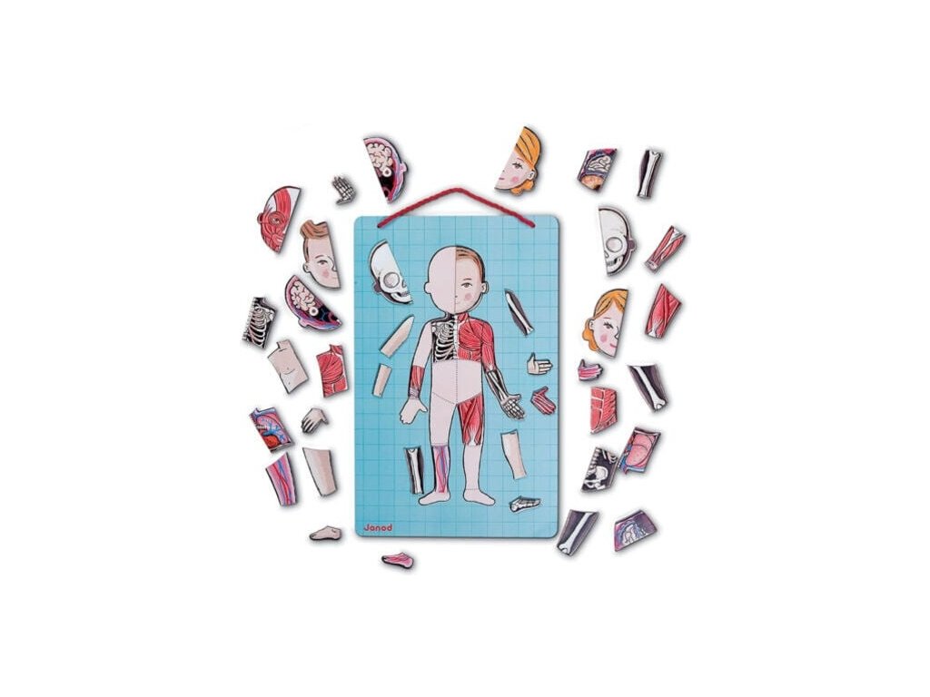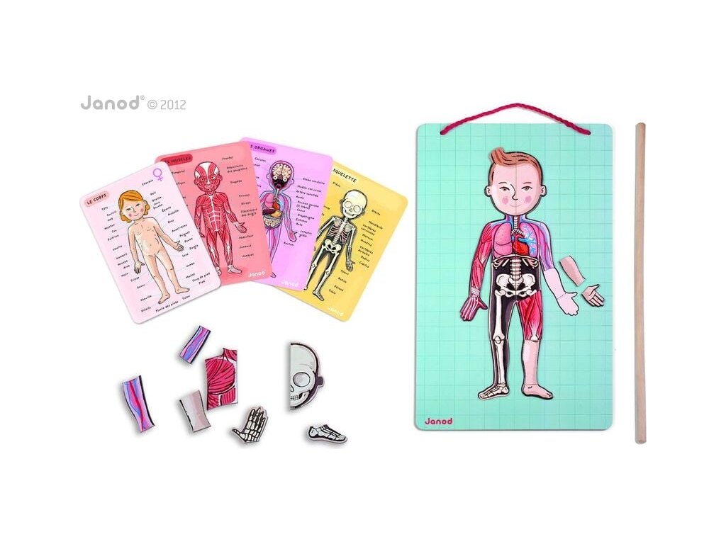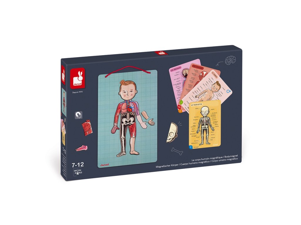 Janod BodyMagnet – magnetická skládačka lidského těla obsahuje 76 kartonových magnetických dílků, magnetickou tabuli, dřevěné ukazovátko a anatomické vzorové karty ve 11 jazycích. Děti mohou skládat vrstvy těla – kosti, orgány, svaly – a učit se o propojení jednotlivých částí. Tabule má praktické rozměry a je navržena tak, aby magnety zůstaly pevně držet. Vhodná hračka pro školáky, kteří chtějí hravou formou poznat lidské tělo.