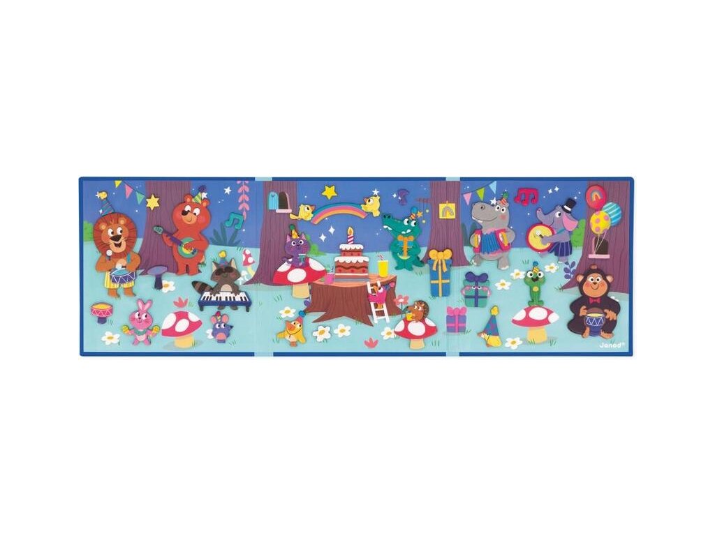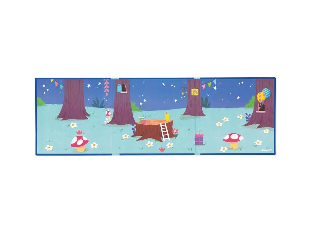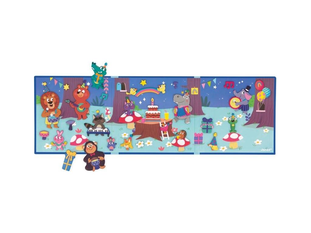 Magnetická kniha Magnetistories Narozeninová párty zvířátek zve děti ke kreativitě a hře. V otevřené podobě odhaluje velké magnetické pozadí, na které lze podle nápadů, nebo vlastní představivosti umisťovat magnetické dílky: od zvířat, balónků, dortů až po dekorace oslavy. Díly pevně přilnou k magnetickému pozadí, takže se snadno přenášejí. Formát knihy zaručuje, že po složení zůstanou všechny dílky uvnitř, což usnadňuje přenos a uskladnění. Tato hračka je určená dětem od 3 let a nabízí hodiny tvořivé i klidné zábavy.