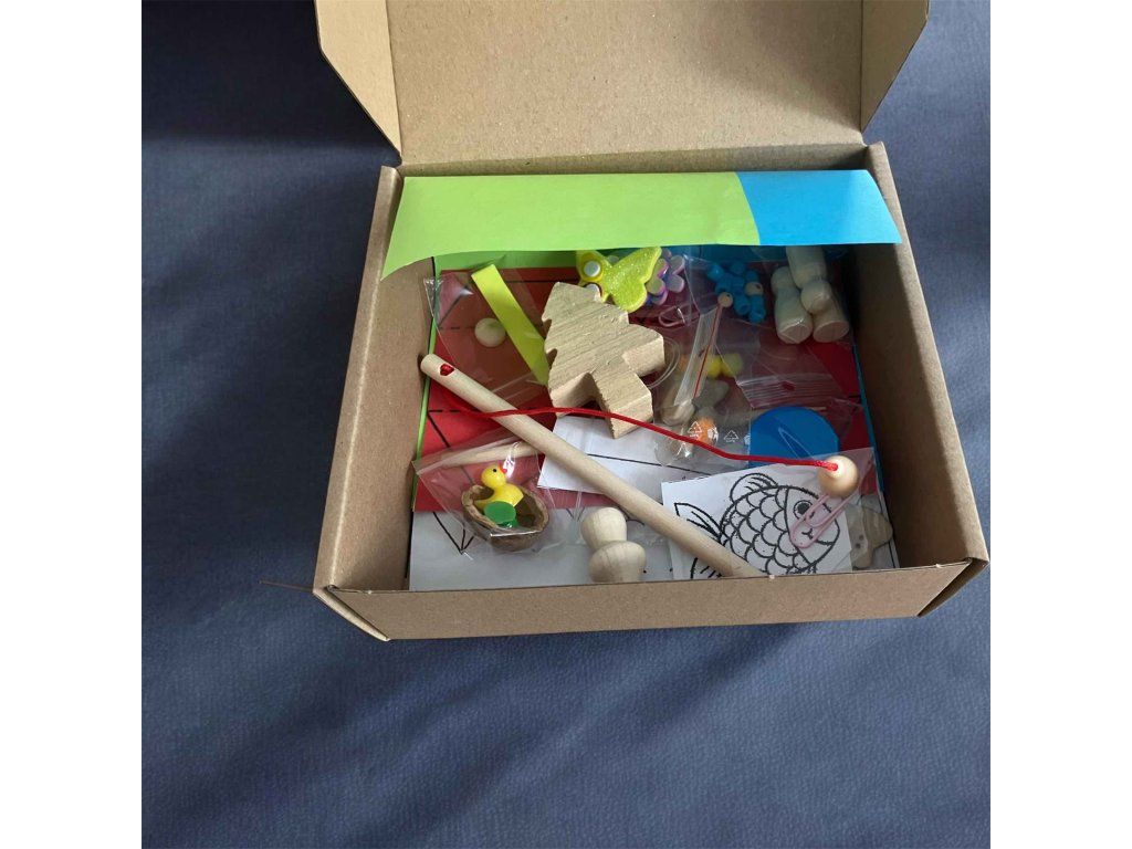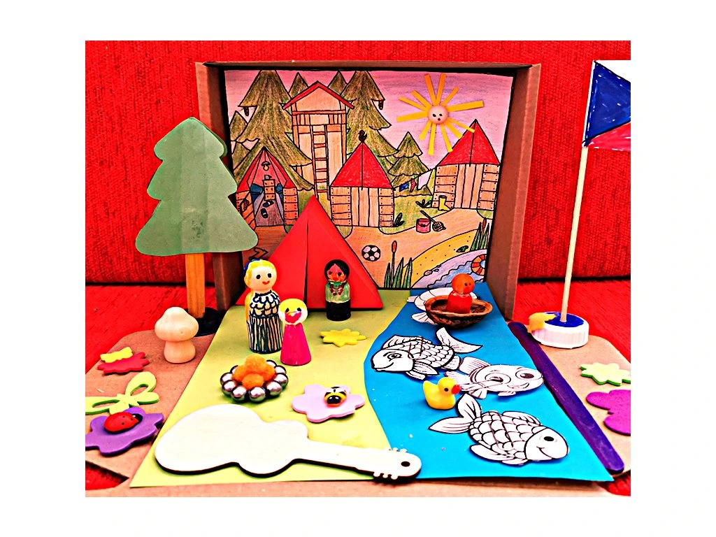 Uvnitř této vyráběnkové krabičky naleznete veškeré komponenty na výrobu krásného letního tábor se stany, dětmi, vlajkou a dokonce rybičkami, které se dají vylovit.