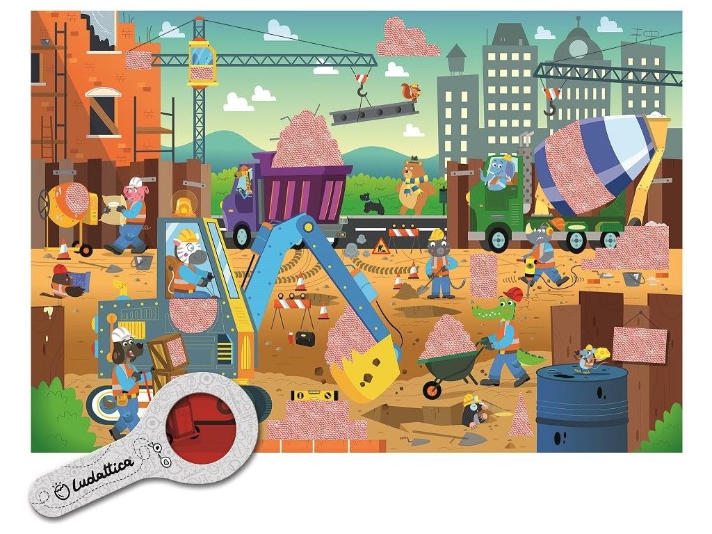 Ludattica Secret Puzzle s lupou – Staveniště je ideální volbou pro malé stavitele od 3 let. Toto odkrývací puzzle obsahuje 24 velkých dílků z pevného kartonu, které po složení vytvoří fascinující obrázek staveniště o rozměrech 50 × 35 cm. Součástí balení je speciální lupa, která umožňuje dětem odhalit skryté detaily a tajemství ukrytá v obrázku.