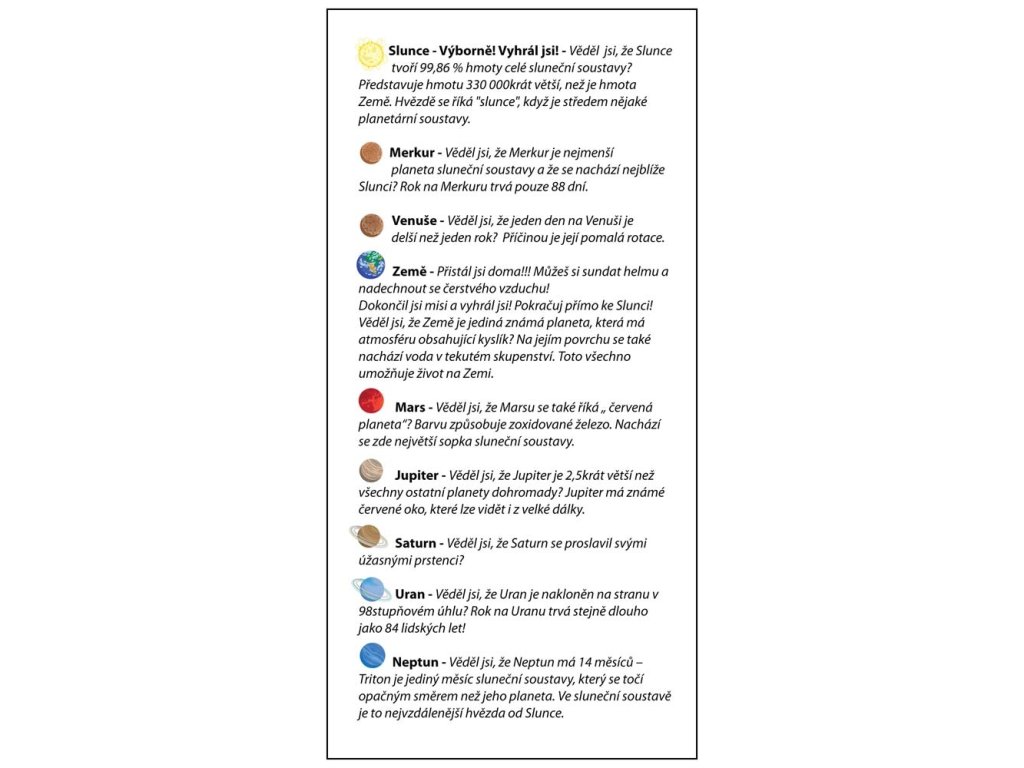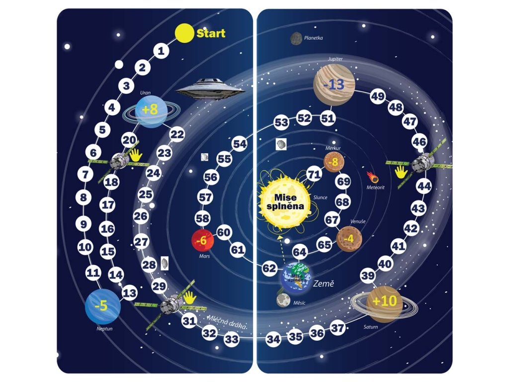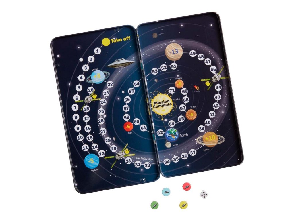 Hráči se střídají v hodech kostkou a posouvají své rakety po Sluneční soustavě. Cílem je přistát jako první na Slunci! Po cestě děti poznávají planety a učí se základní orientaci ve vesmíru, aniž by ztratily herní tempo.