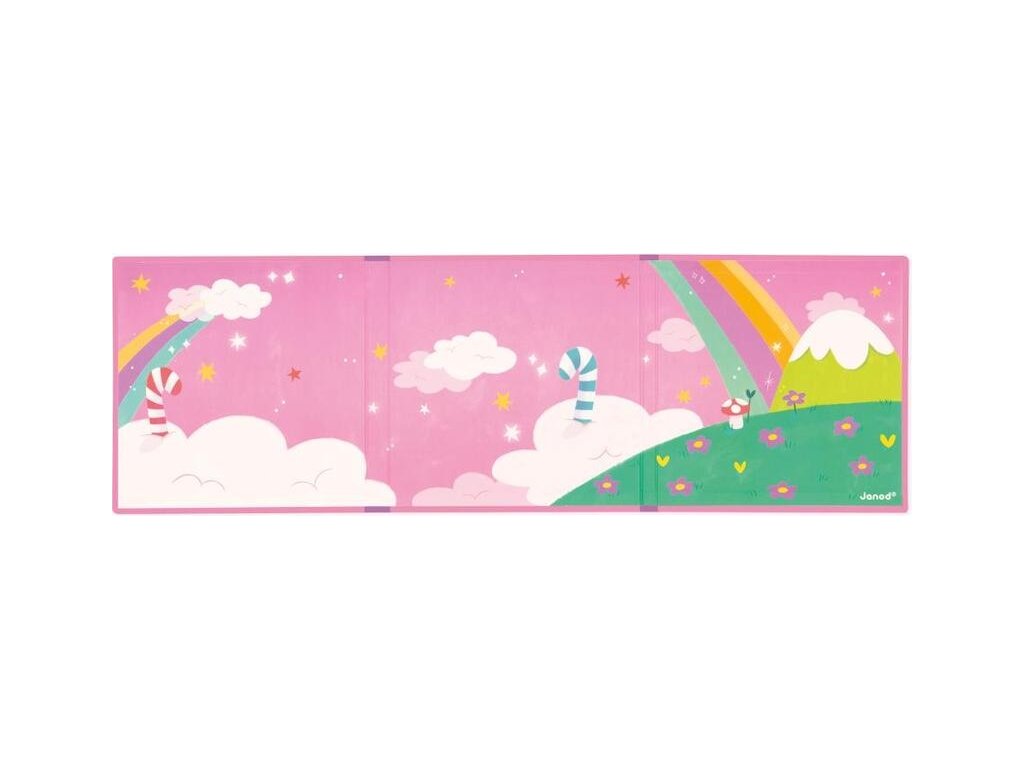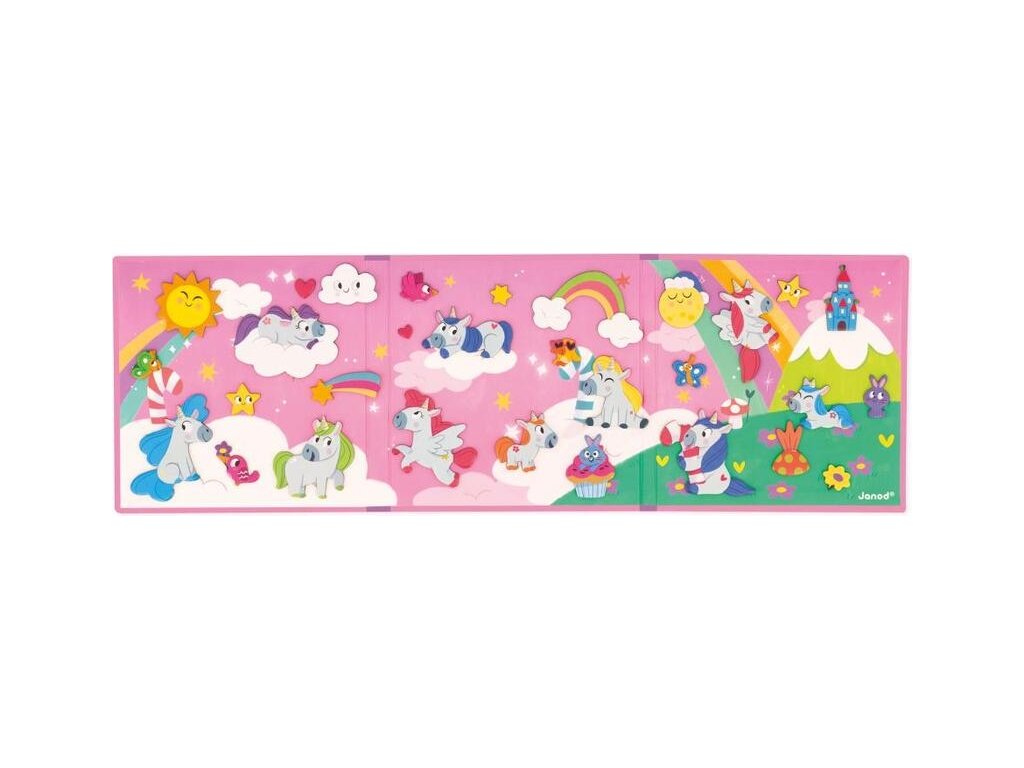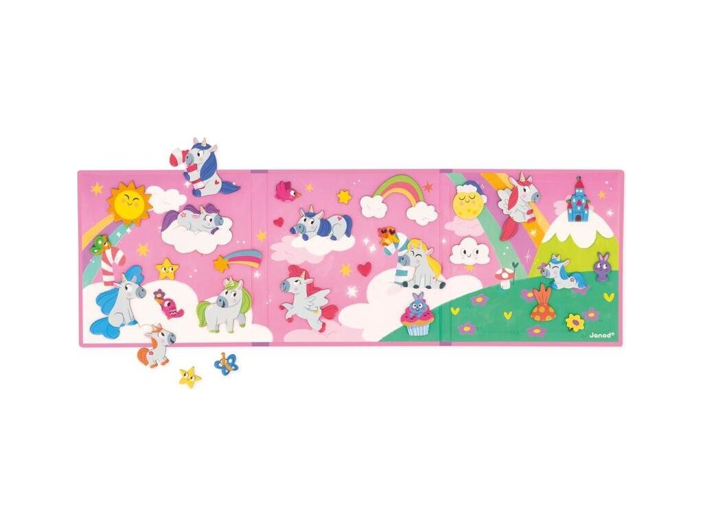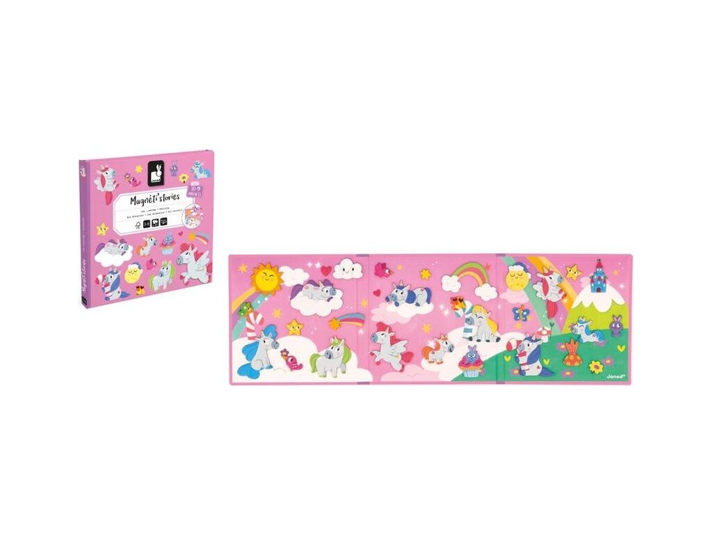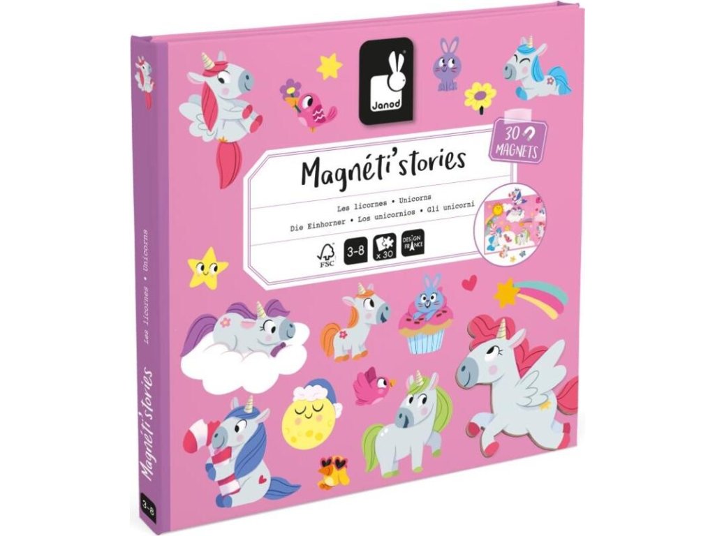 Magnetická kniha Magnetistories Jednorožec přináší dětem možnost tvořit magické světy jednorožců. S 30 magnetickými dílky a tématickým pozadím si děti mohou skládat scény podle vzorů nebo podle své fantazie. Díly jsou snadno uchopitelné, pevně drží díky magnetům, a celý set je navržený tak, aby se dal snadno přenášet – všechny části se ukládají do „knihy“ formátu. Produkt je určen pro děti od 3 let a kombinuje prvky zábavy i vzdělávání.