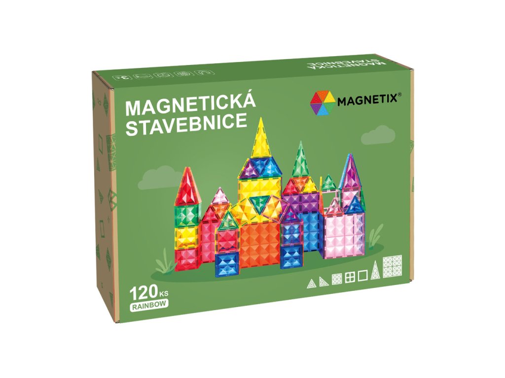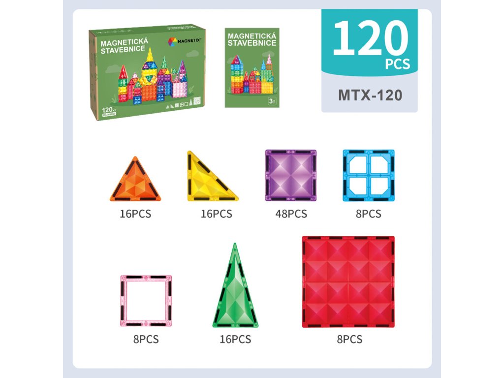 Magnetix MTX-120 je velká kreativní magnetická stavebnice s hvězdicovým, pyramidovým designem, která potěší děti i dospělé. Sada obsahuje 120 dílků různých tvarů a velikostí – čtverce, trojúhelníky, okna a velké panely. Dílky jsou průhledné, zářivě barevné a pevné, takže stavby vypadají efektně na světle a zároveň dlouho vydrží.