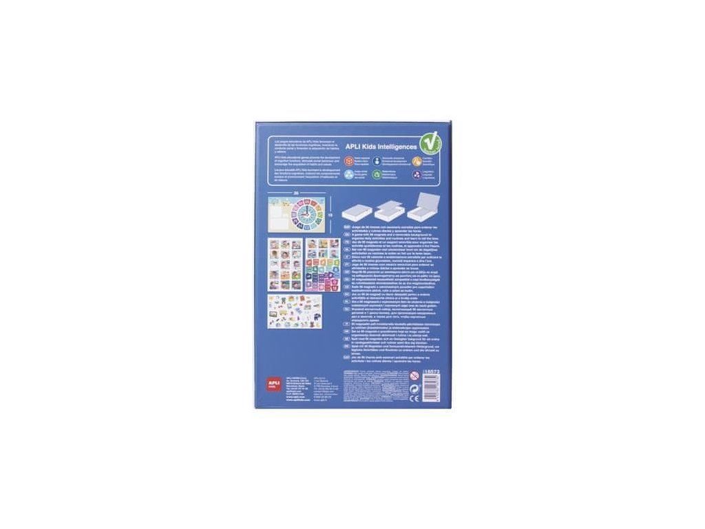 Každá sada obsahuje: 1 magnetický stolek o rozměrech 28 x 18 cm, který se vejde na základnu pouzdra, a 96 magnetických žetonů s různými částmi hodin a různými scénáři a aktivitami, které usnadňují učení hodin.