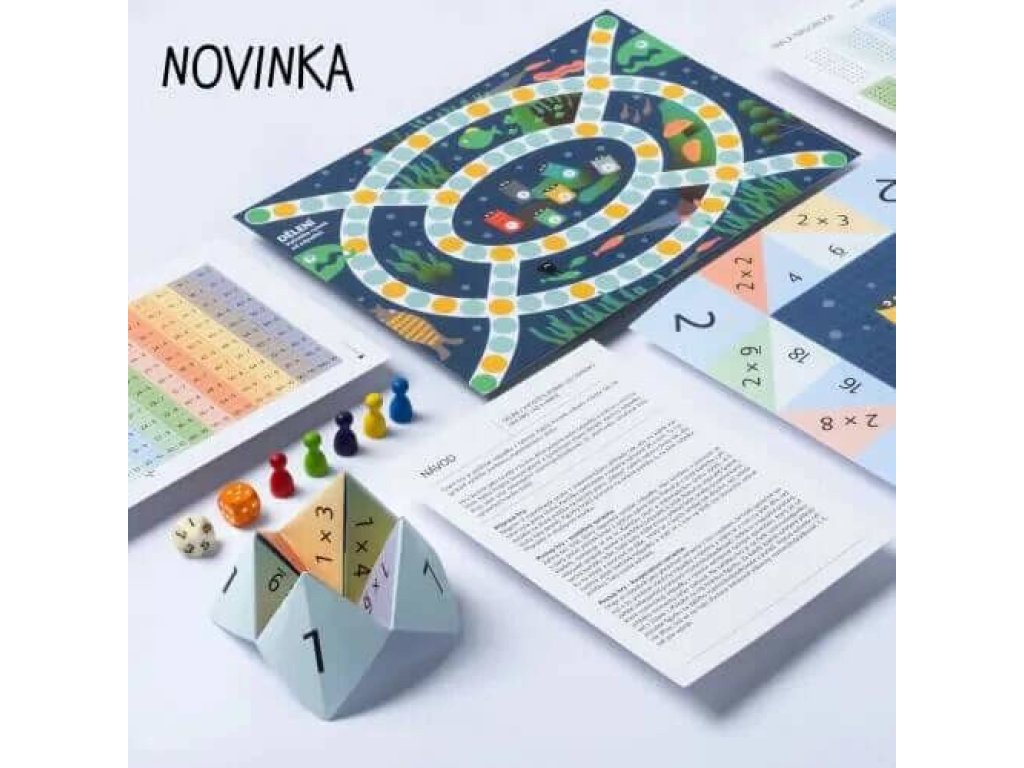 - hru (herní plán) na dělení: V této hře mají hráči za úkol vyčistit rybník od odpadků. Odpadek mohou vylovit tak, že správně vyřeší matematickou úlohu. Při přípravě hry si sami určujete, jaké rovnice jsou ve hře. Můžete zvolit příklady z celé malé násobilky, nebo jen příklady s vybranými činiteli, které zrovna děti potřebují trénovat. Hru lze hrát buď kooperativně nebo konkurenčně. Velikost herního plánu A4.