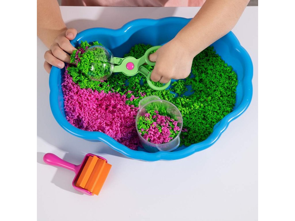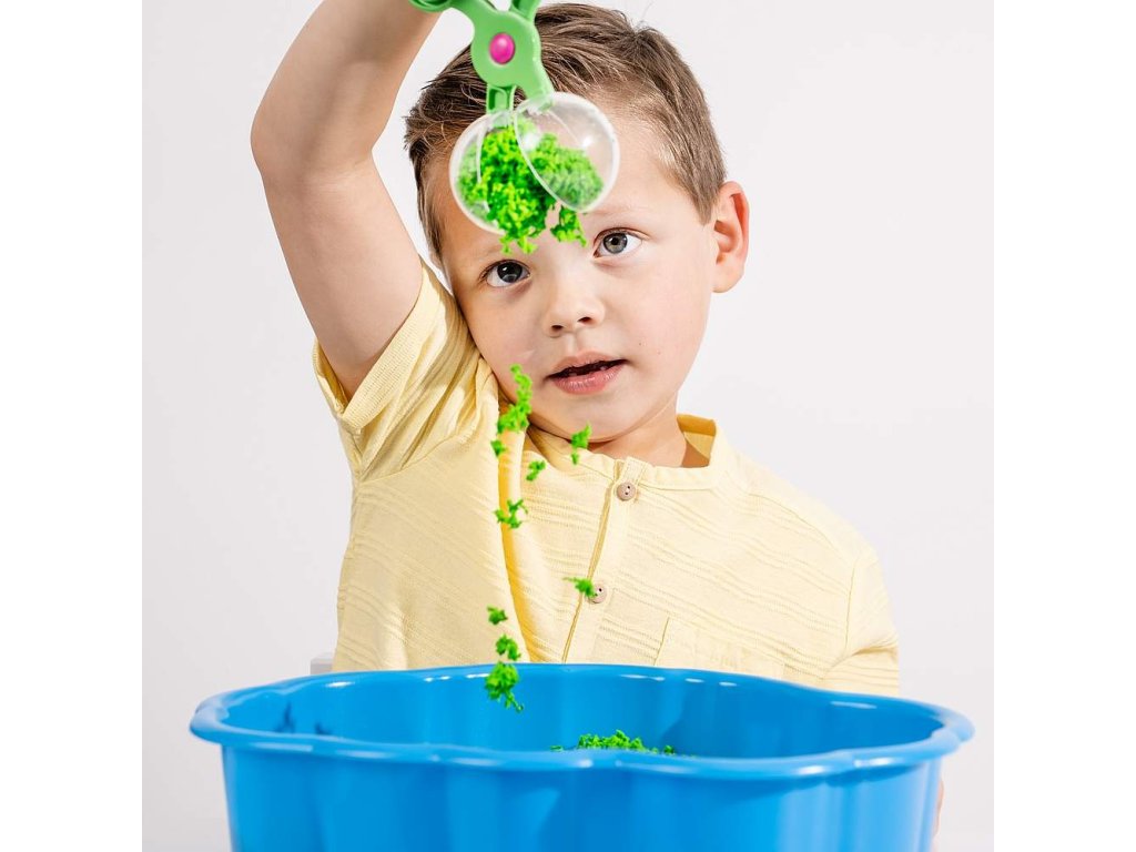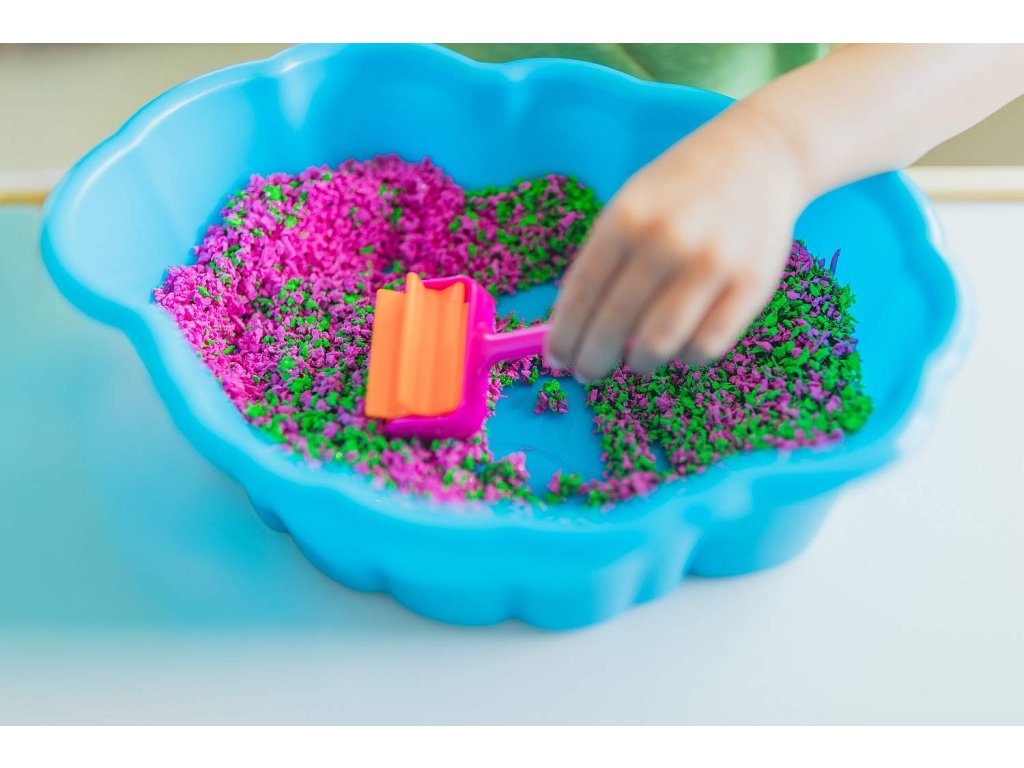 - Smyslovou vaničku na hmotu o rozměrech 30 cm x 25 cm o výšce 8 cm, Dvě barvy pěnové hmoty Playfoam® Pluffle a 3 nástroje pro trénink jemné motoriky - ruční váleček, nůžkové naběračky a nabírací kelímek.