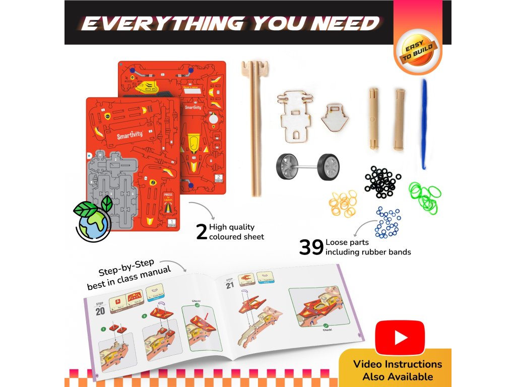 Nejdříve je nutné model sestavit podle obrázkového návodu. Spoje i pohybové mechanismy využívají gumové pásky (rubber bands) a mechanický launcher. Po sestavení vznikne racing autíčko Speedster s pojistným odpalovacím mechanismem – dítě jej vloží do launcheru, stiskne a sleduje, jak autíčko vyrazí vpřed vysokou rychlostí.