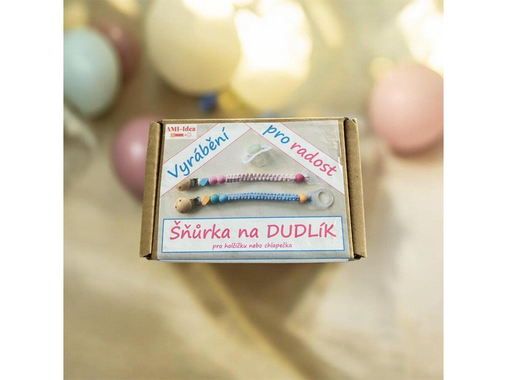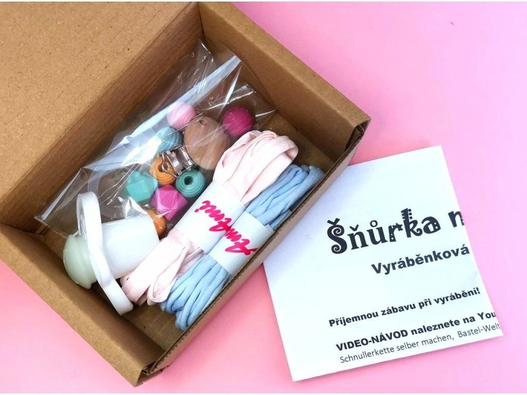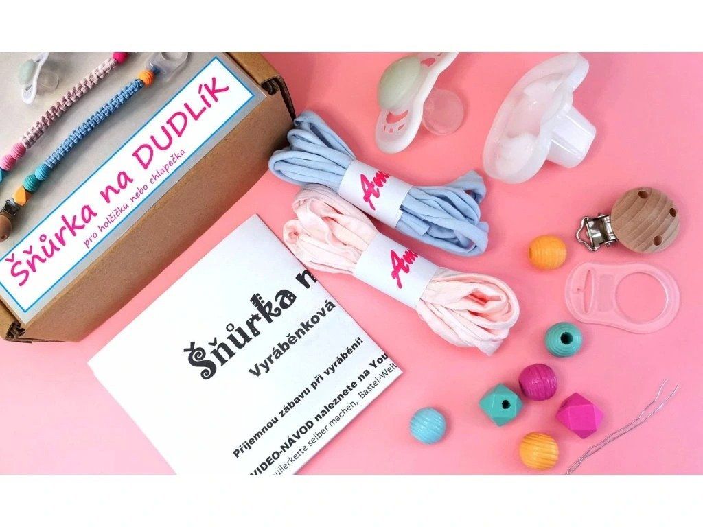V této vyráběnkové krabičce najdete všechny komponenty, potřebné k výrobě krásné a přitom snadné šňůrky na dudlíček pro miminko. Z jedné strany šňůrky je silikonově držátko, kam se vloží dudlík a z druhé je klip, který se dítěti připevní na oblečení. Takto už děťátko svůj dudlíček neztrácí.