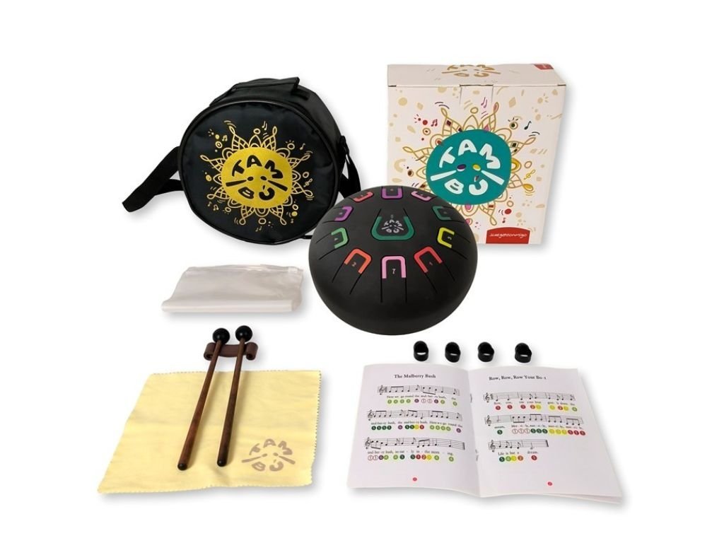 Poznejte výrazný zvuk a eleganci s černým Tambú 8″ — stylovým bubínkem, který osloví jak děti, tak dospělé. Tento nástroj je laděn v G dur (Sol) a nabízí diatonickou stupnici s barevným a číselným značením tónů, což činí hraní přístupným i pro začátečníky, kteří dosud neovládají klasické noty.
