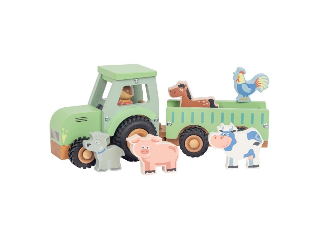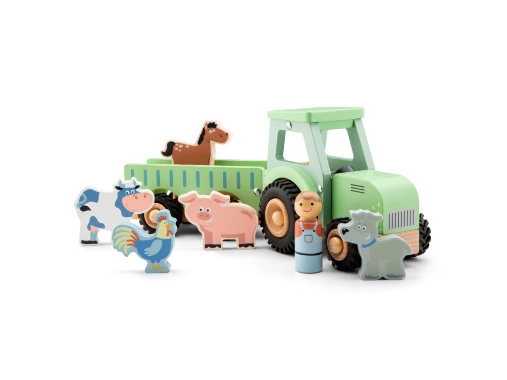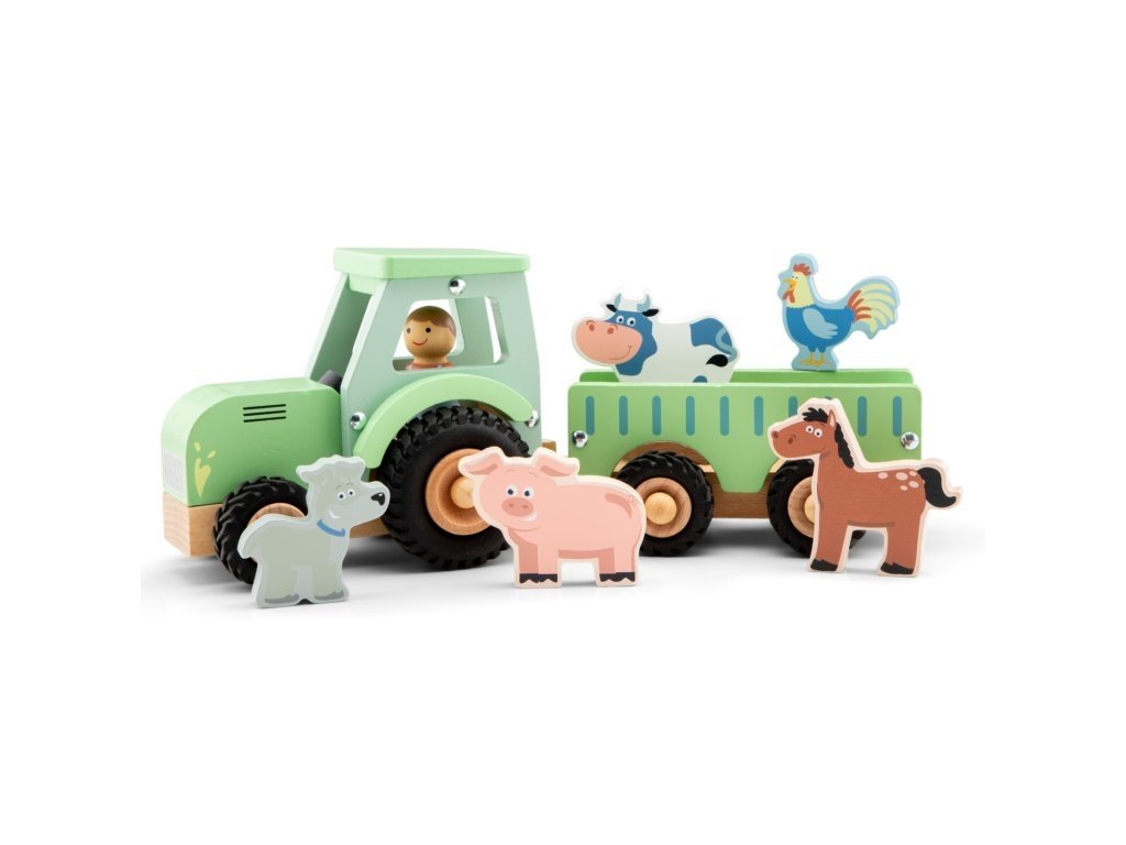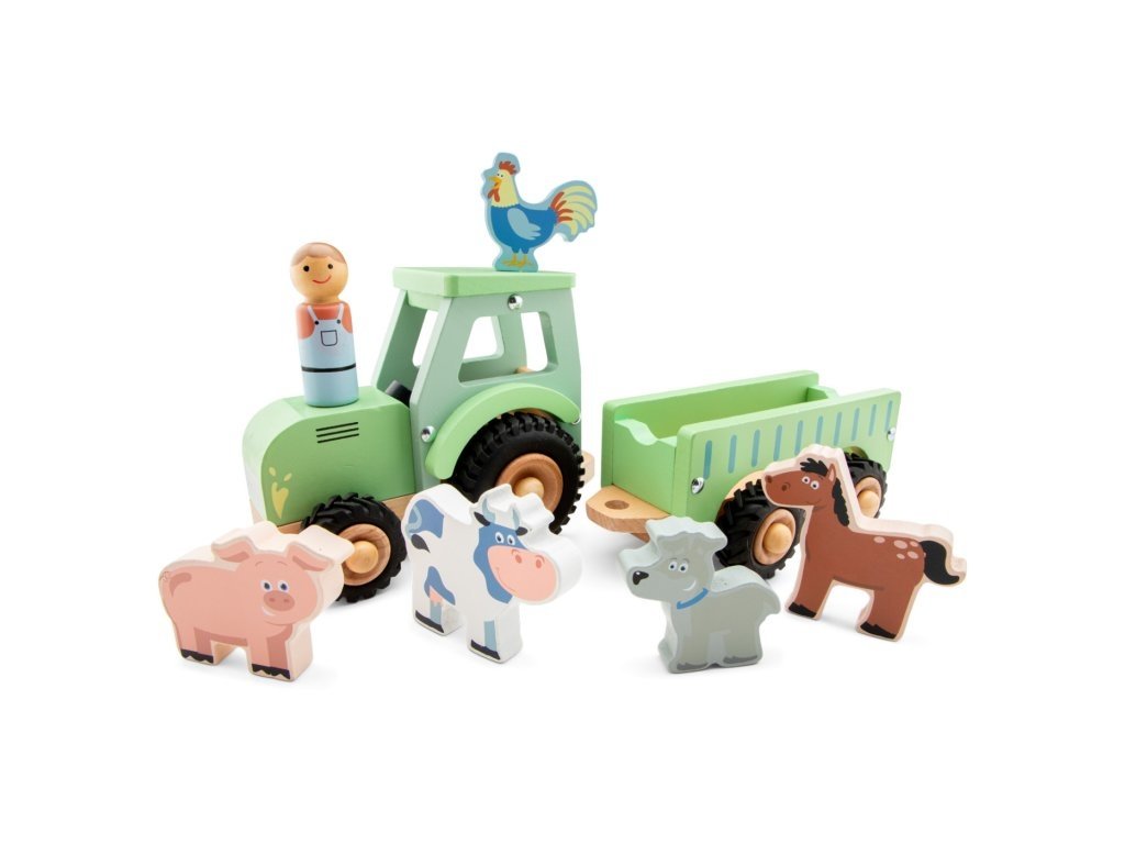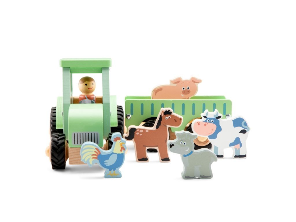 Tento dřevěný traktor od New Classic Toys je navržen pro děti od 3 let, které milují kouzlo venkova. Set obsahuje traktor s odnímatelným přívěsem, který si děti mohou samy tlačit. V balení naleznou také pět roztomilých zvířátek: kravičku, selátko, koníka, štěňátko a kohouta.